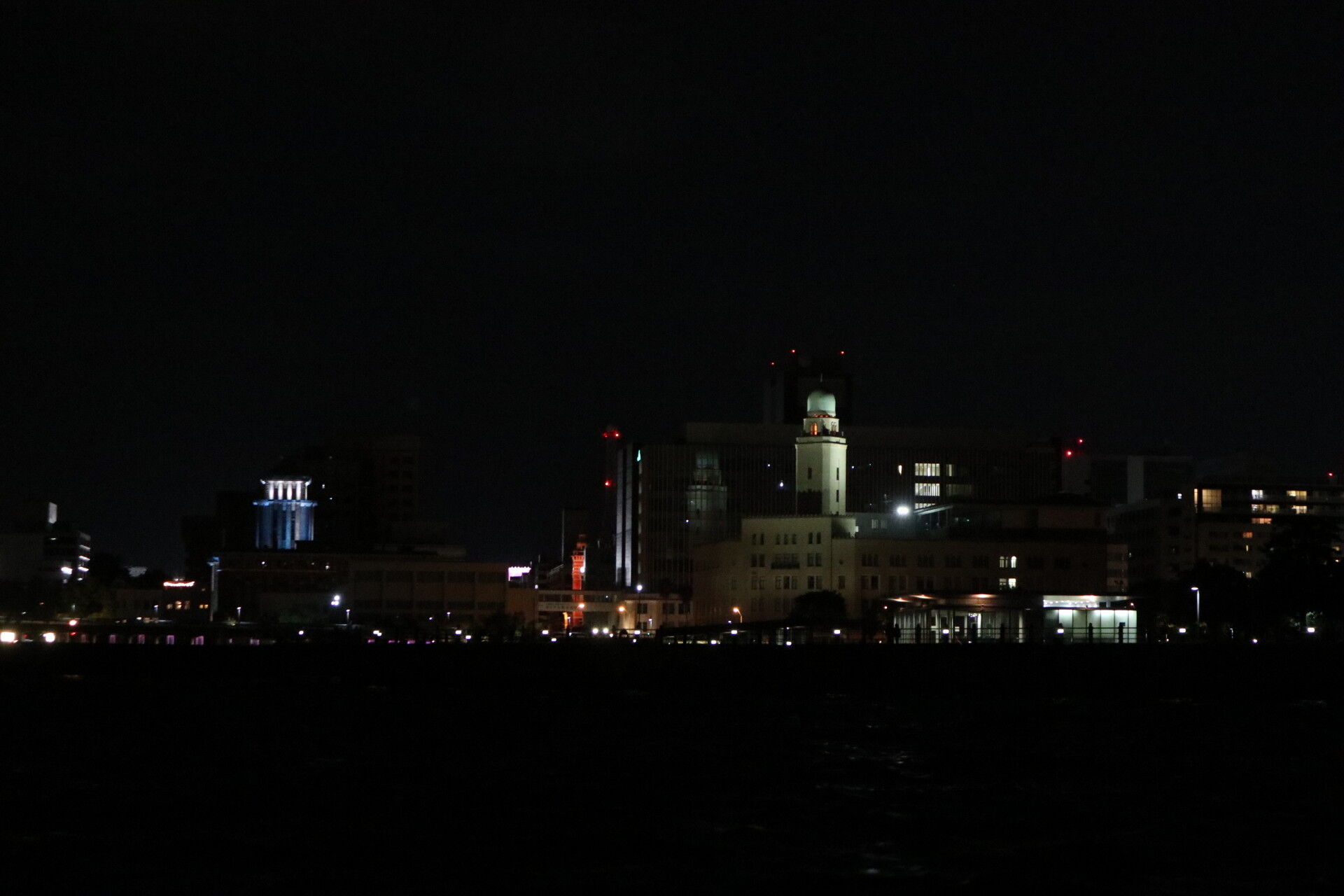 船から見上げると、ホテル最上階にいる女神像「みちびき」がこちらを見ているのですね。