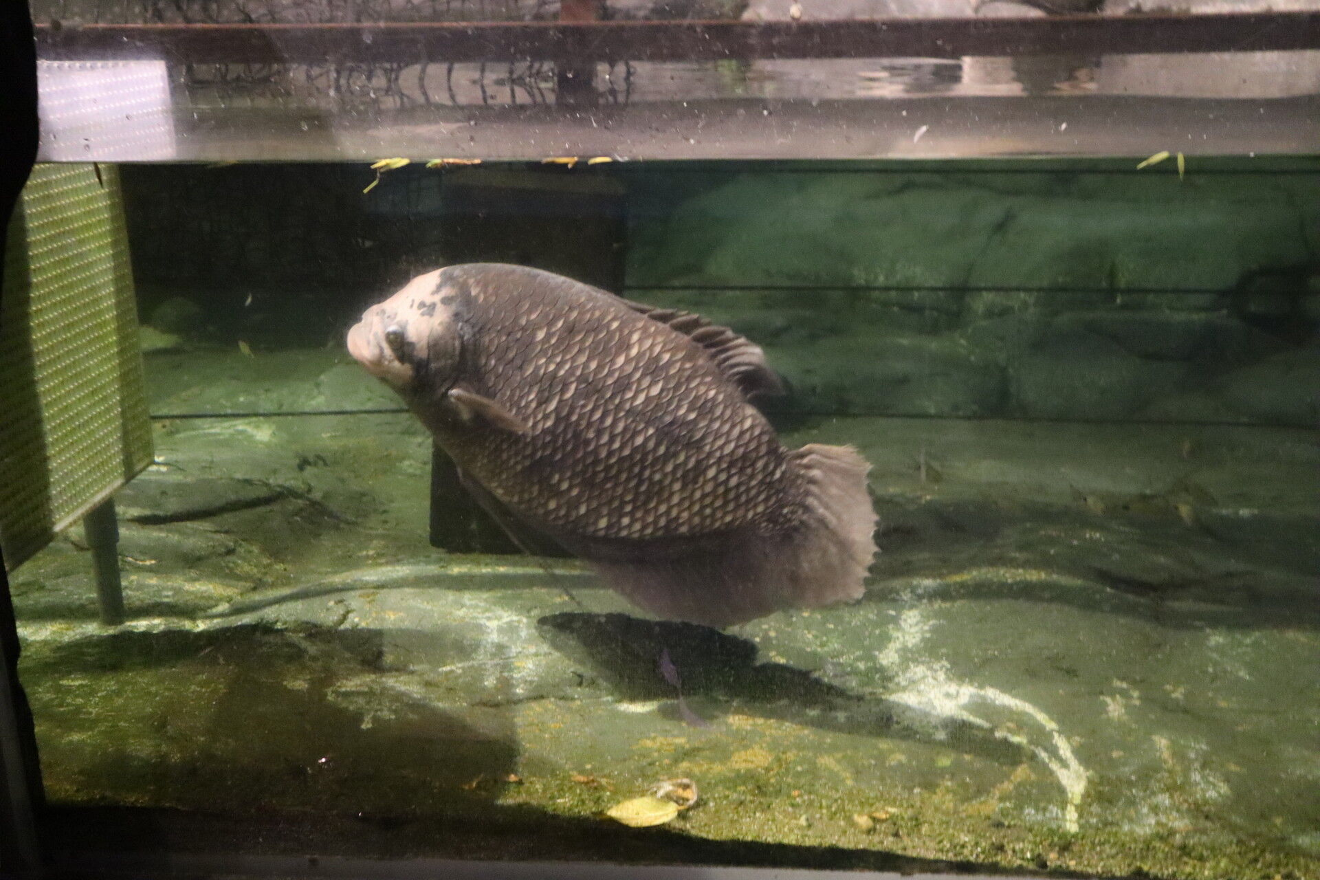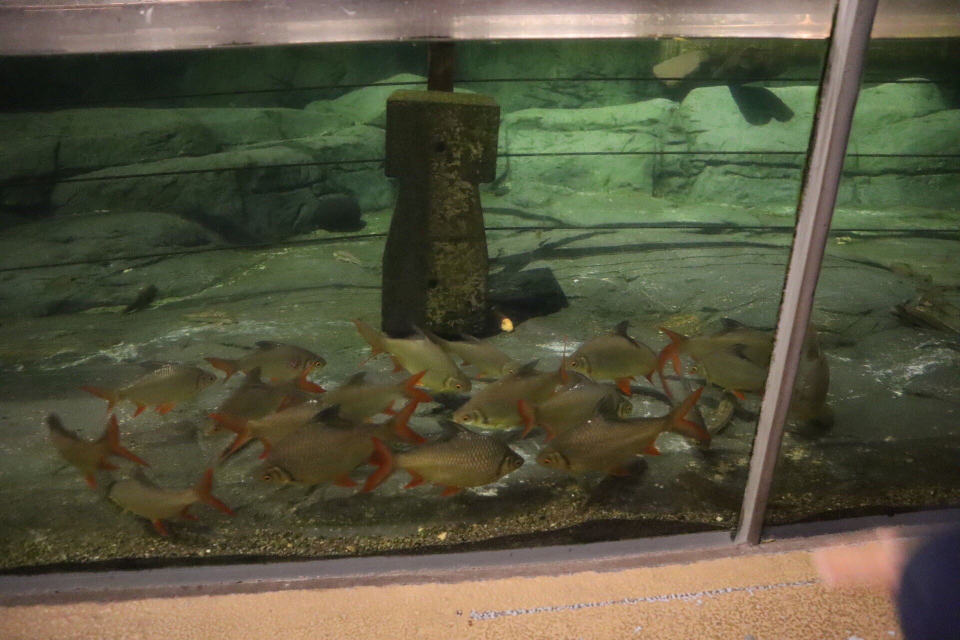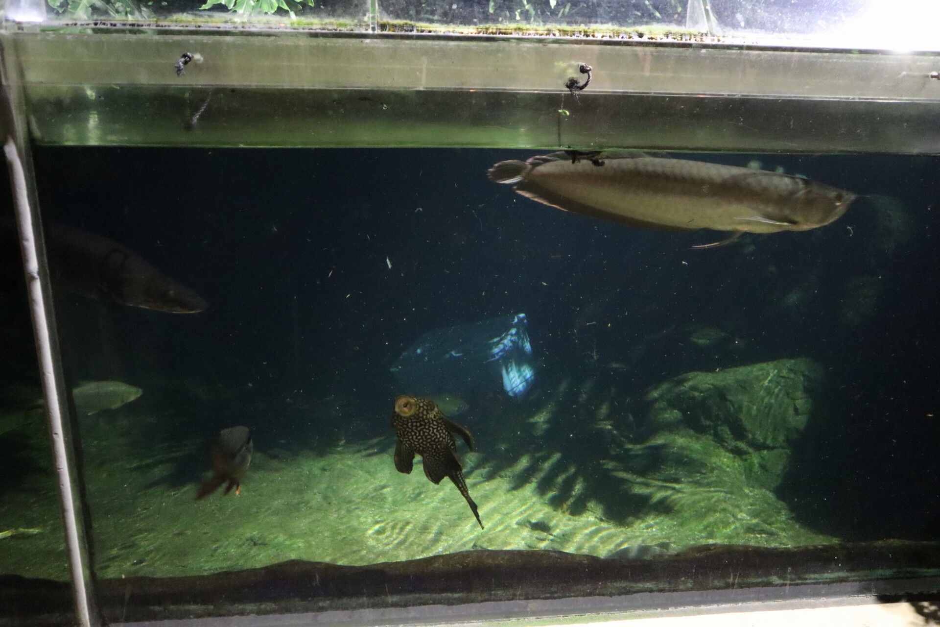 この水槽は昔から暗くてよく見えない中にピラニアとか怖い魚がいっぱい泳いでるんですよね。