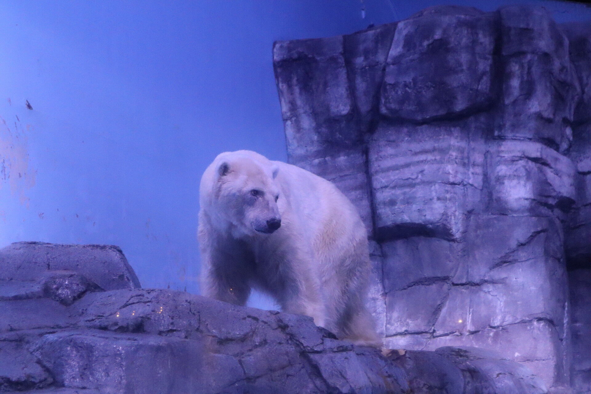 この水槽、下に魚がおよいでいるのですが、クマはわざわざ狩りをしなくてもごはんにありつけるから襲わないんですかねぇ。全く世界が違うように見えます。