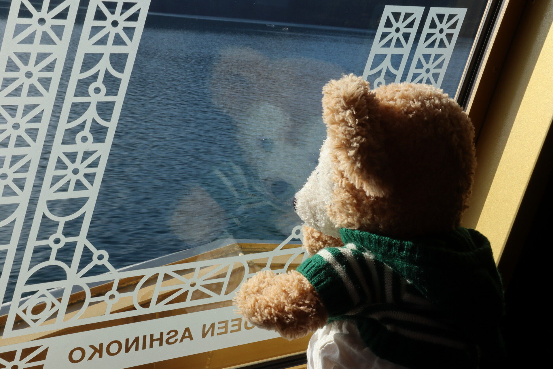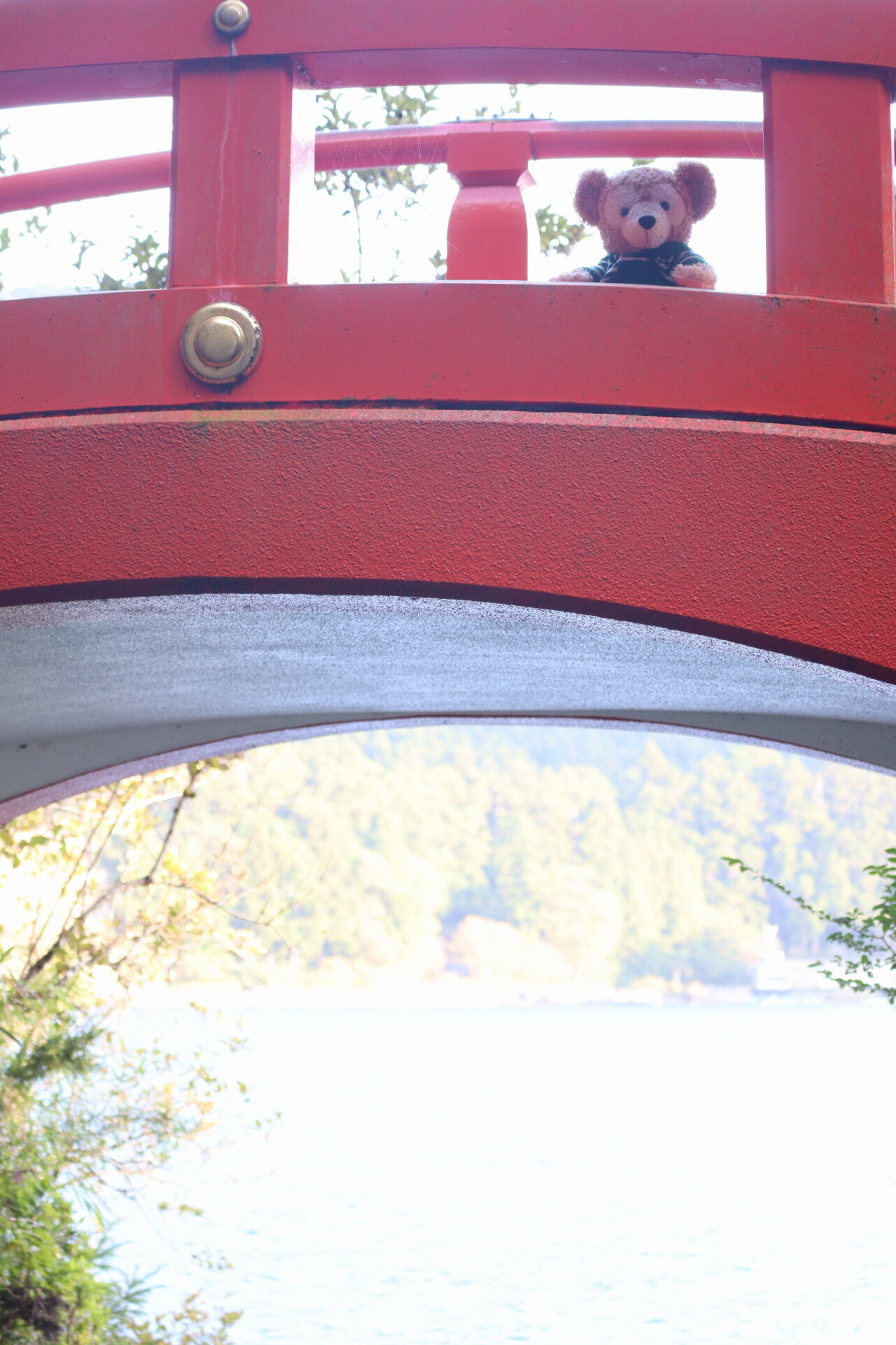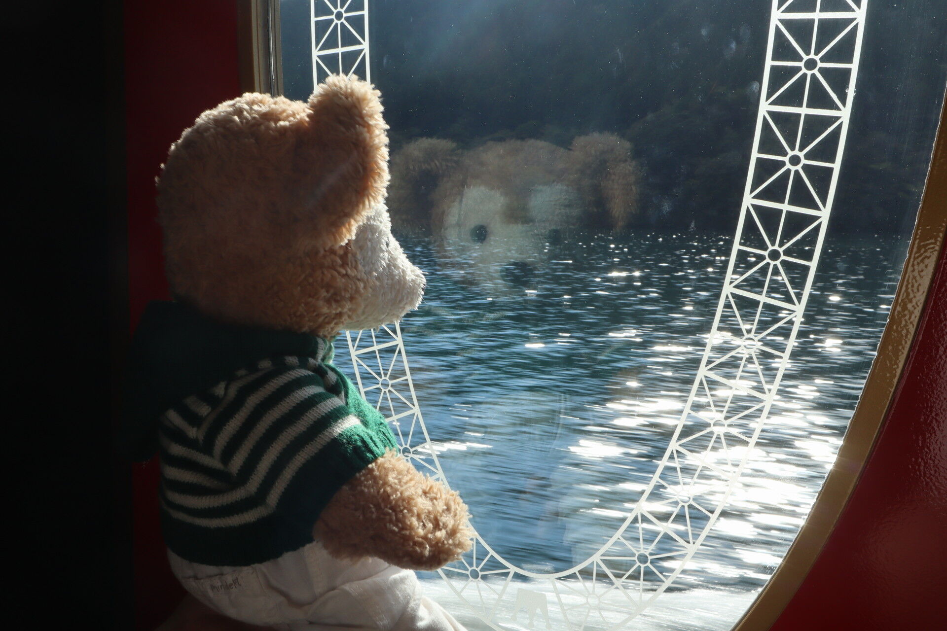 水面のきらめき。ダッフィーは写り込ませて表情を見せるけど自分たちは隠れる光の配置が難しい。