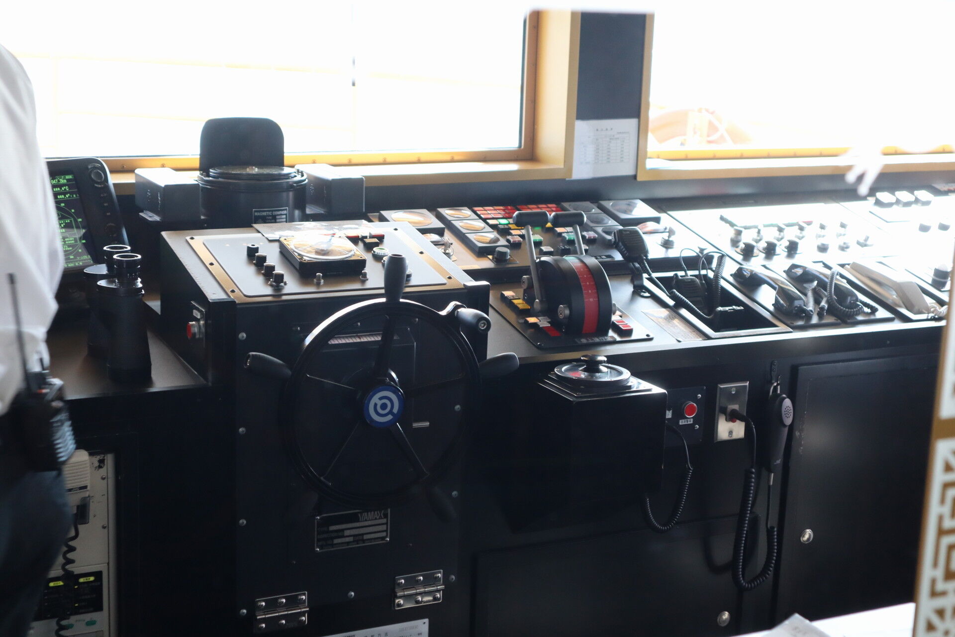 やはり舵輪はそれっぽい形をしているものなんですね。飛行機のパワーレバーのようなものが機関を操作するものでしょうか?