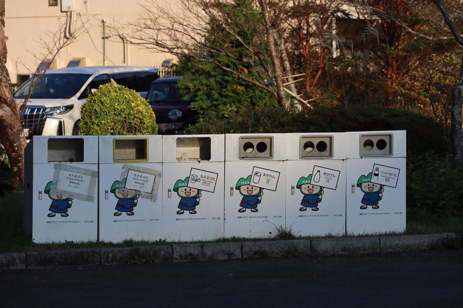 ゴミ箱が並んでいます。はこジ郎というらしい。