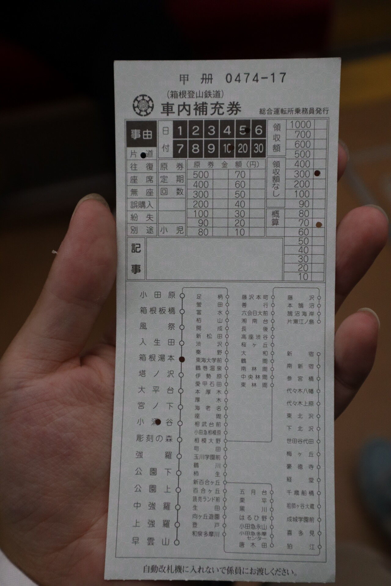 改札鋏がはいります。小田急が硬券やめてるので、今時珍しいですよね。