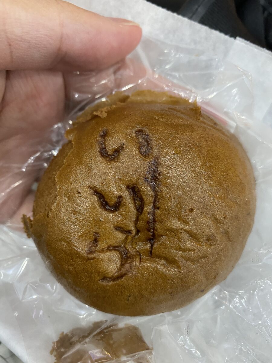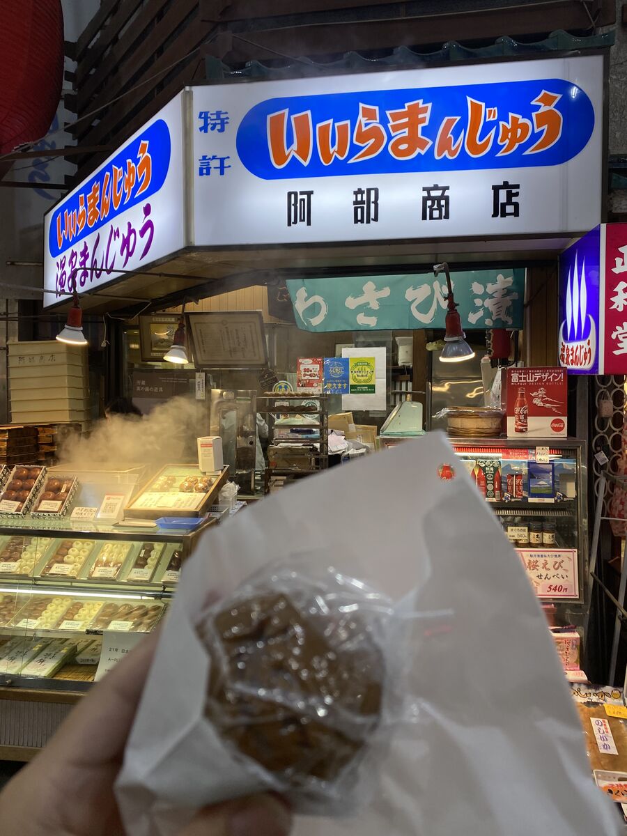 熱海の仲見世通りで温泉まんじゅうを食べます。