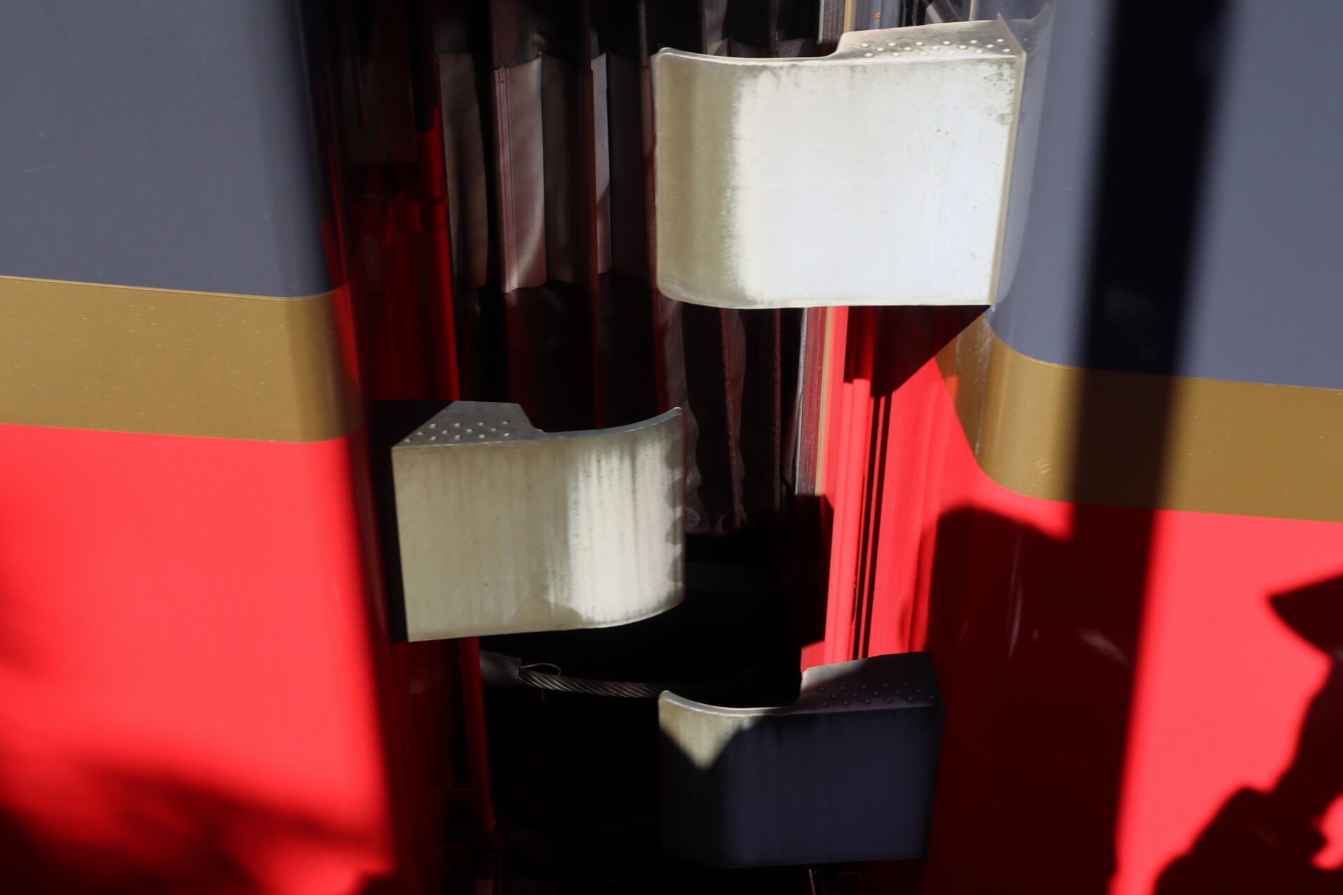 ケーブルカーの連結は棒連結器で行われていて、万が一連結器が破損したときのためにさらにケーブルでつないでいます。