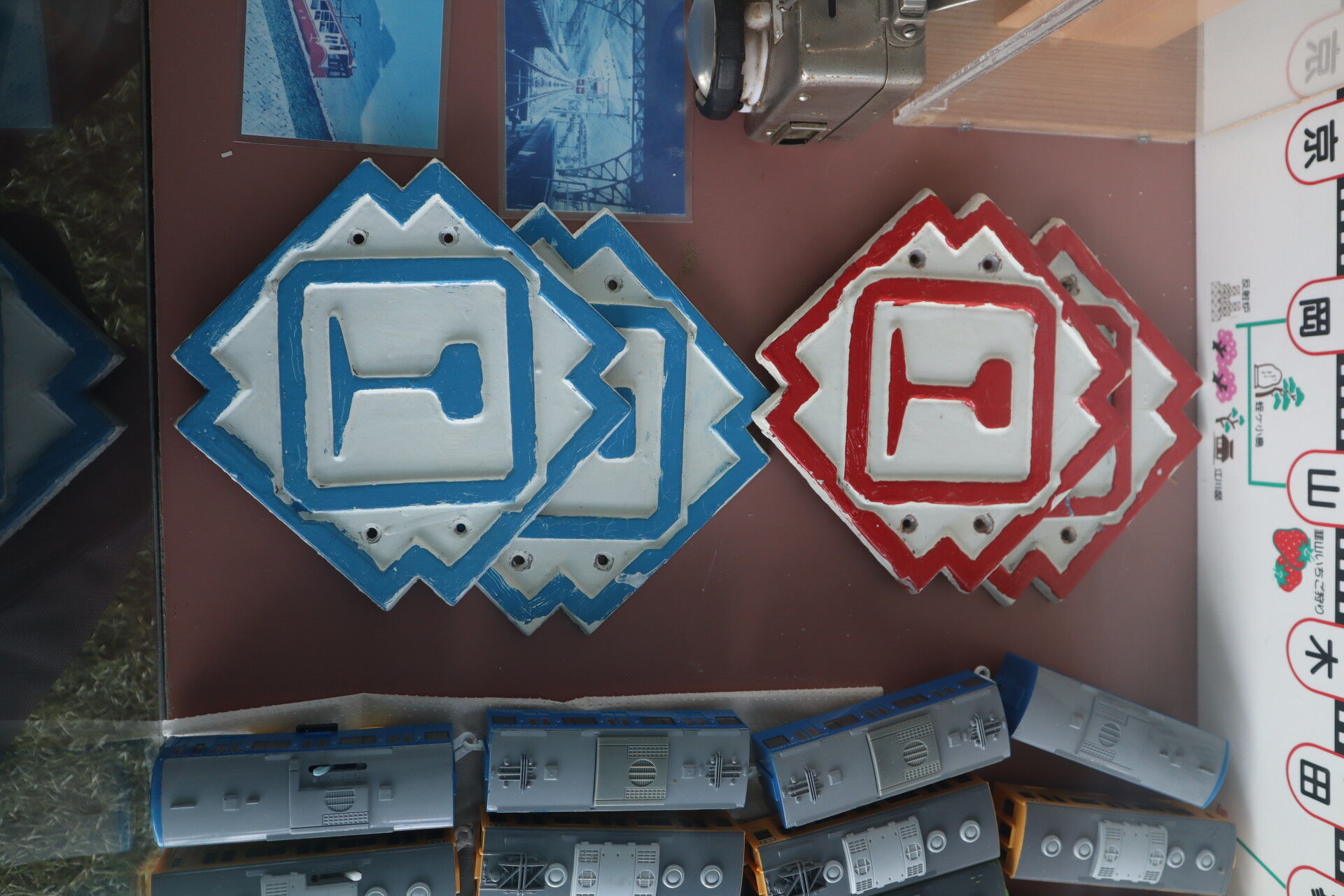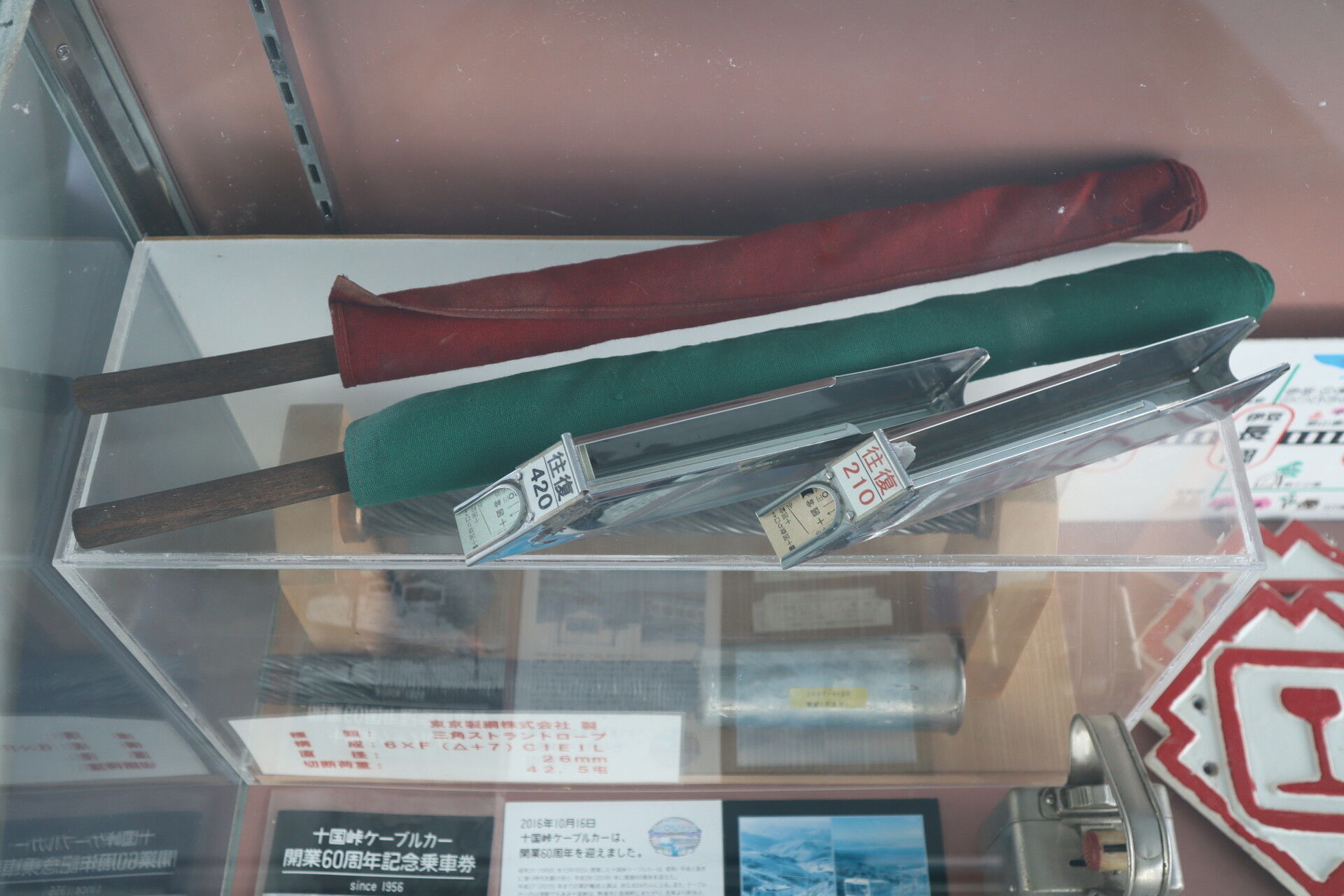 ショーケースの中に旗や切符などのケーブルカーグッズが並んでいました。