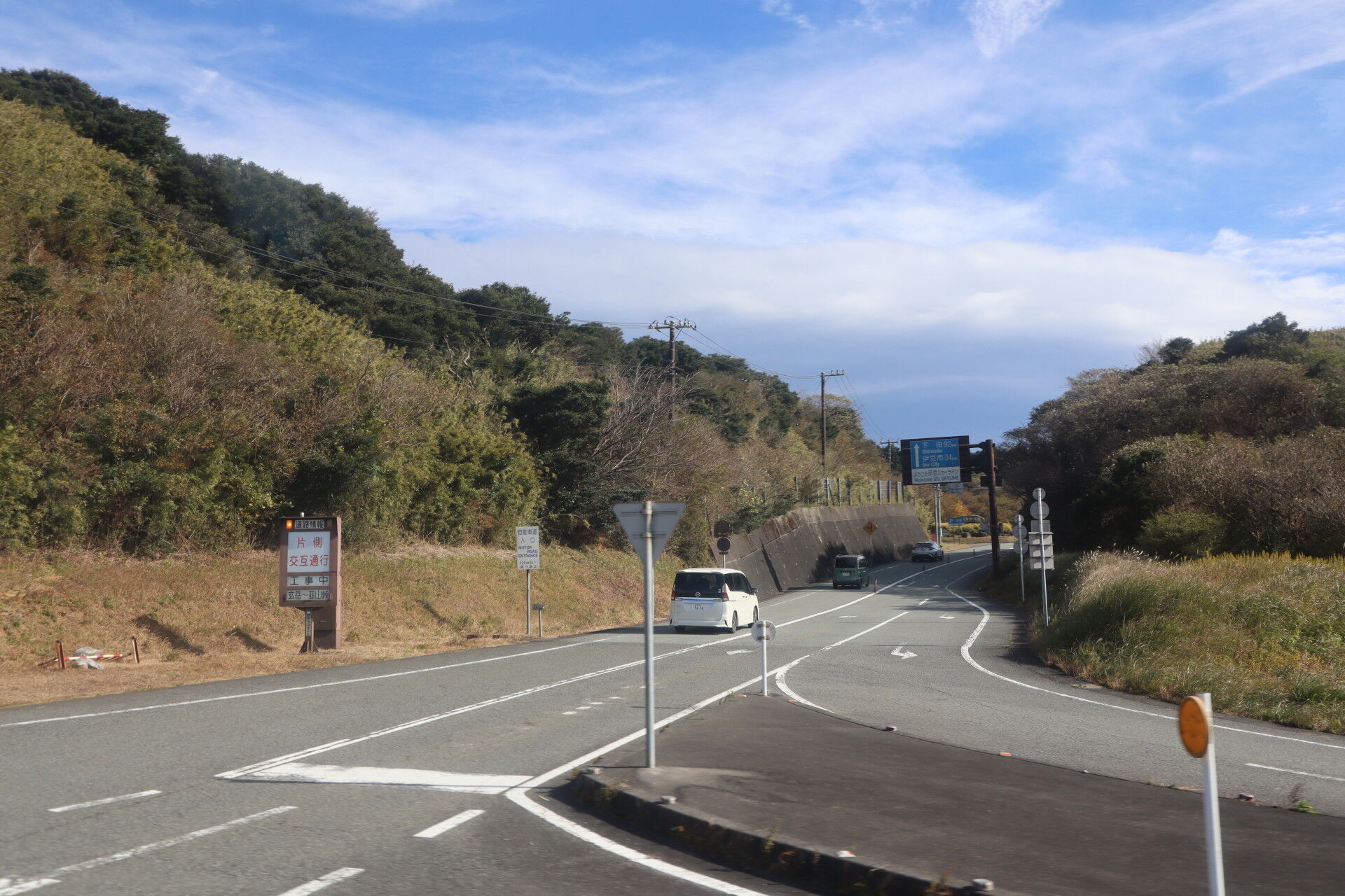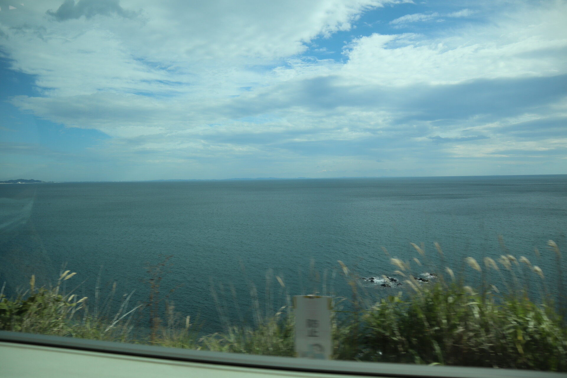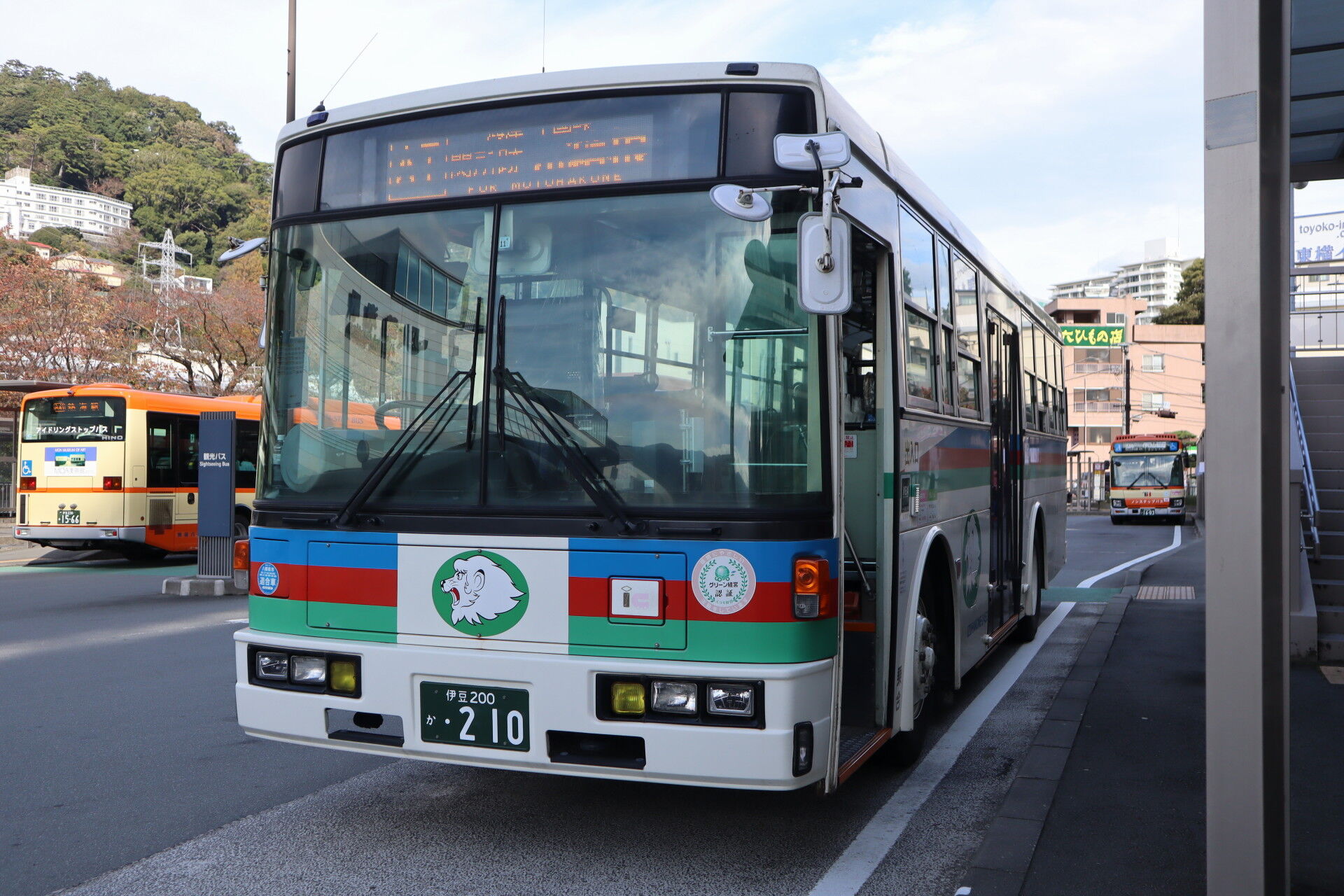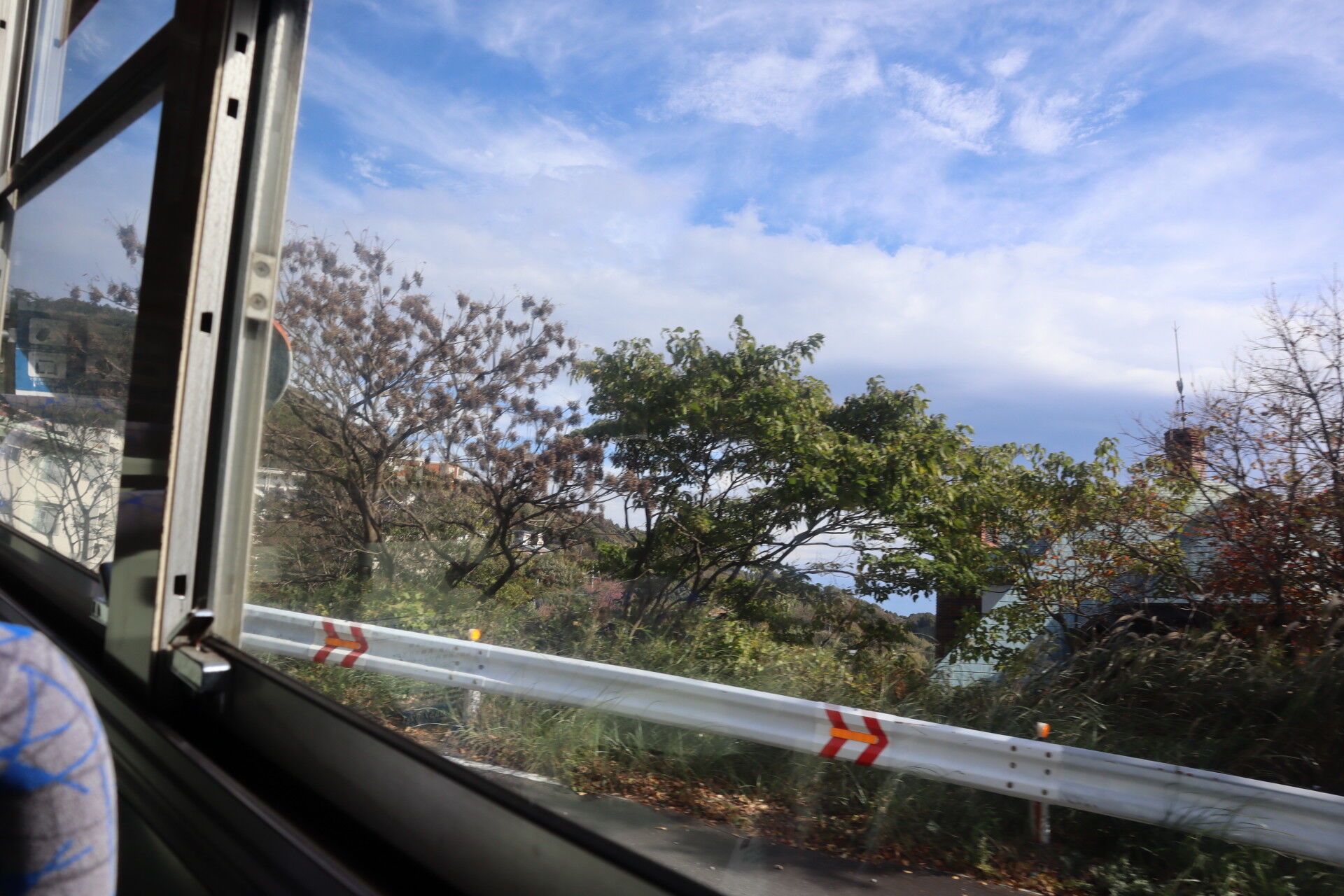 バスは熱海の市街地を海側にぐるっと回って、来宮神社から山道に入ります。向こうに伊豆大島が見えますね。