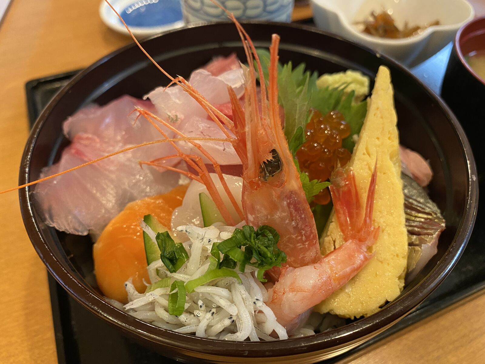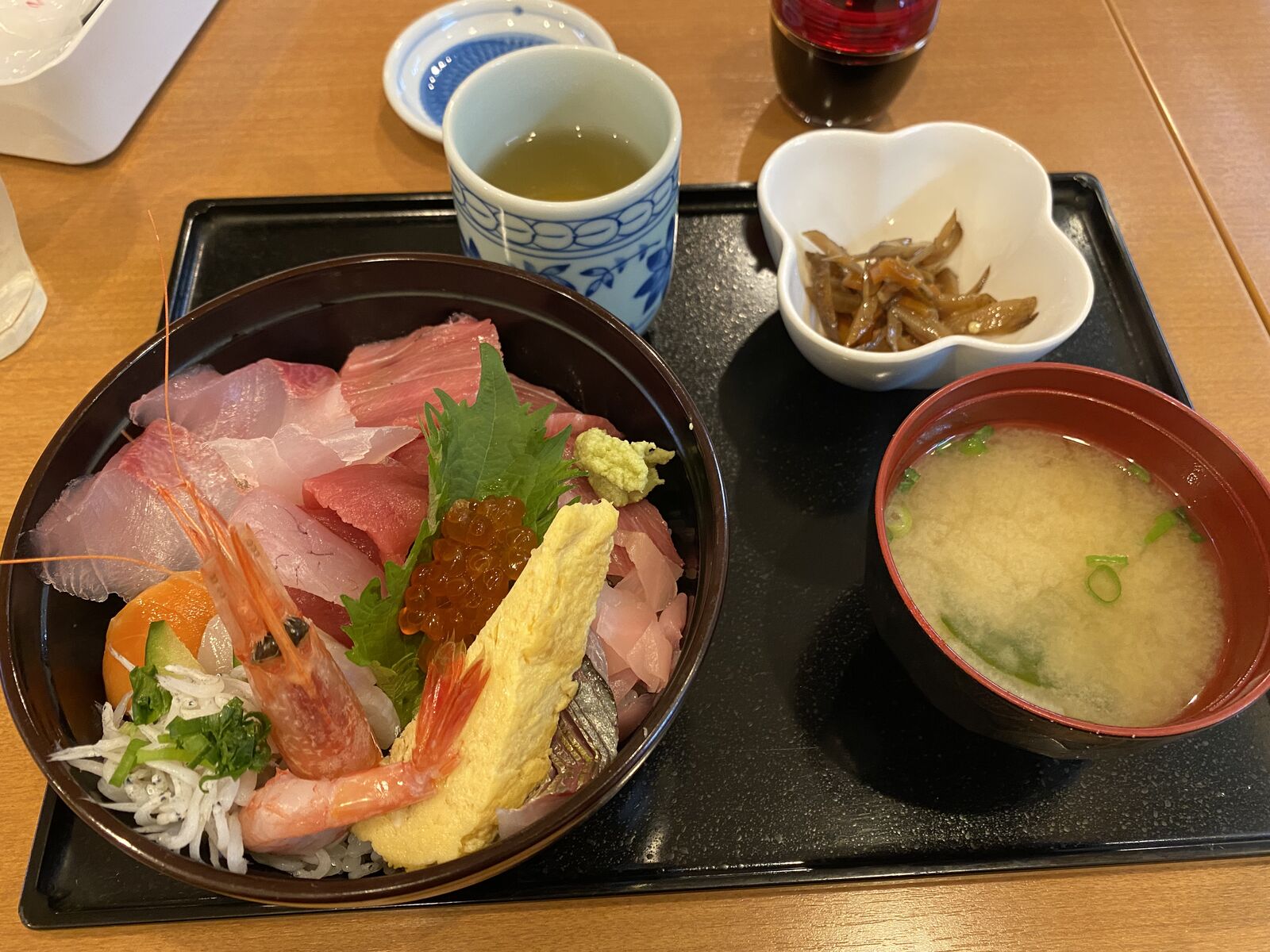 地アジの定食と悩んだけど、海鮮丼をチョイス。