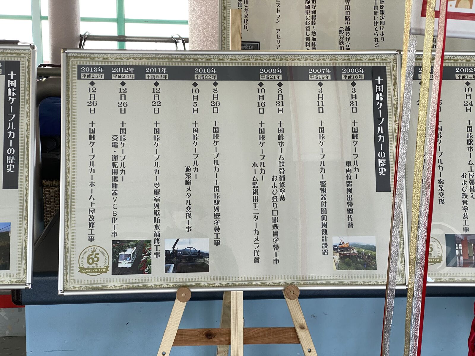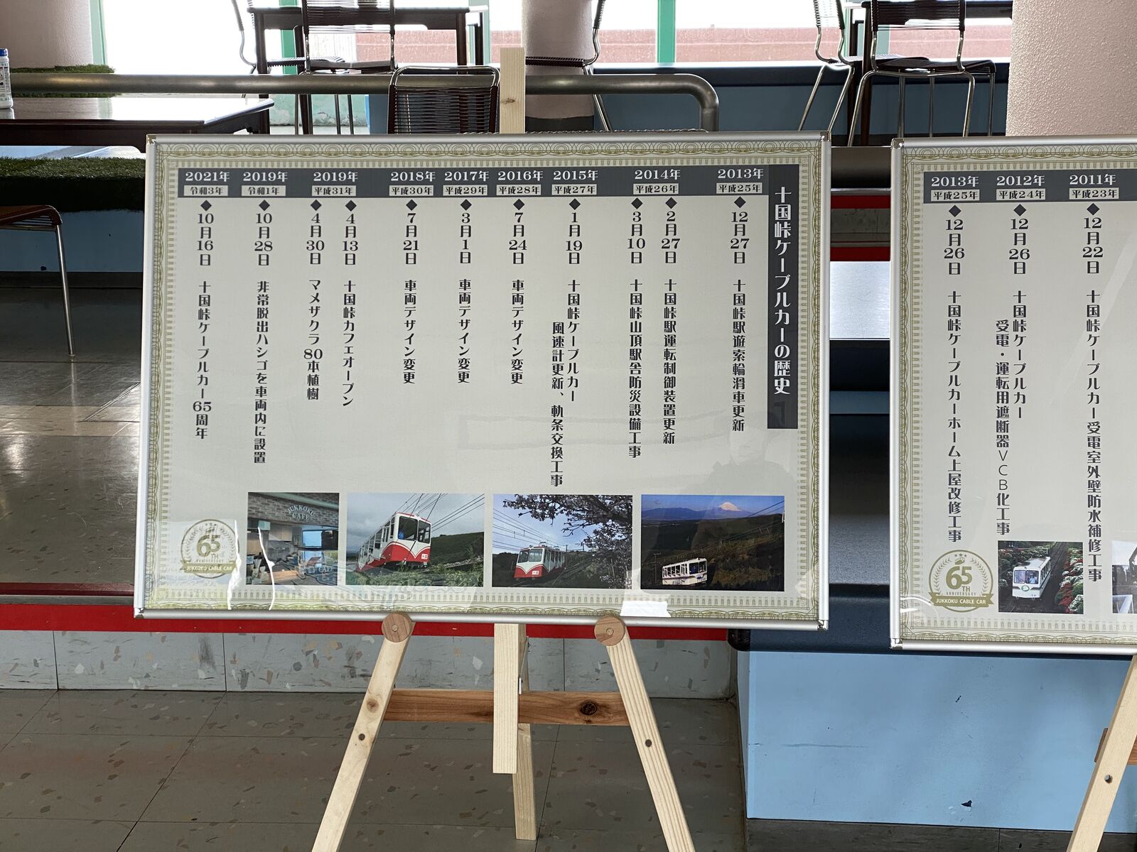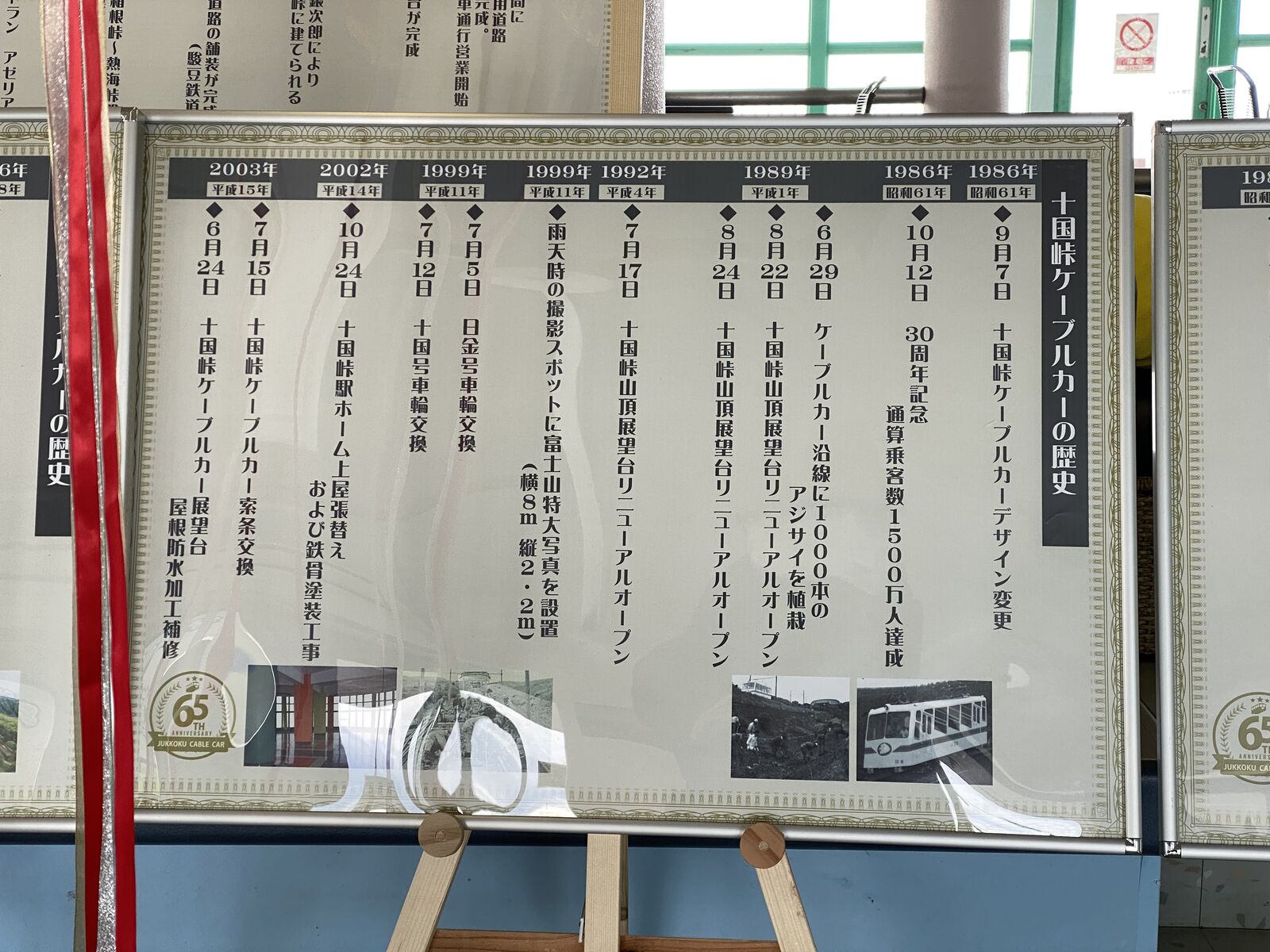 1階には、10月に迎えたケーブルカー65周年記念イベントのくす玉と歴史年表の展示がありました。伊豆箱根鉄道としても最後の周年イベントでしょうし気合が入っていたのでしょう。