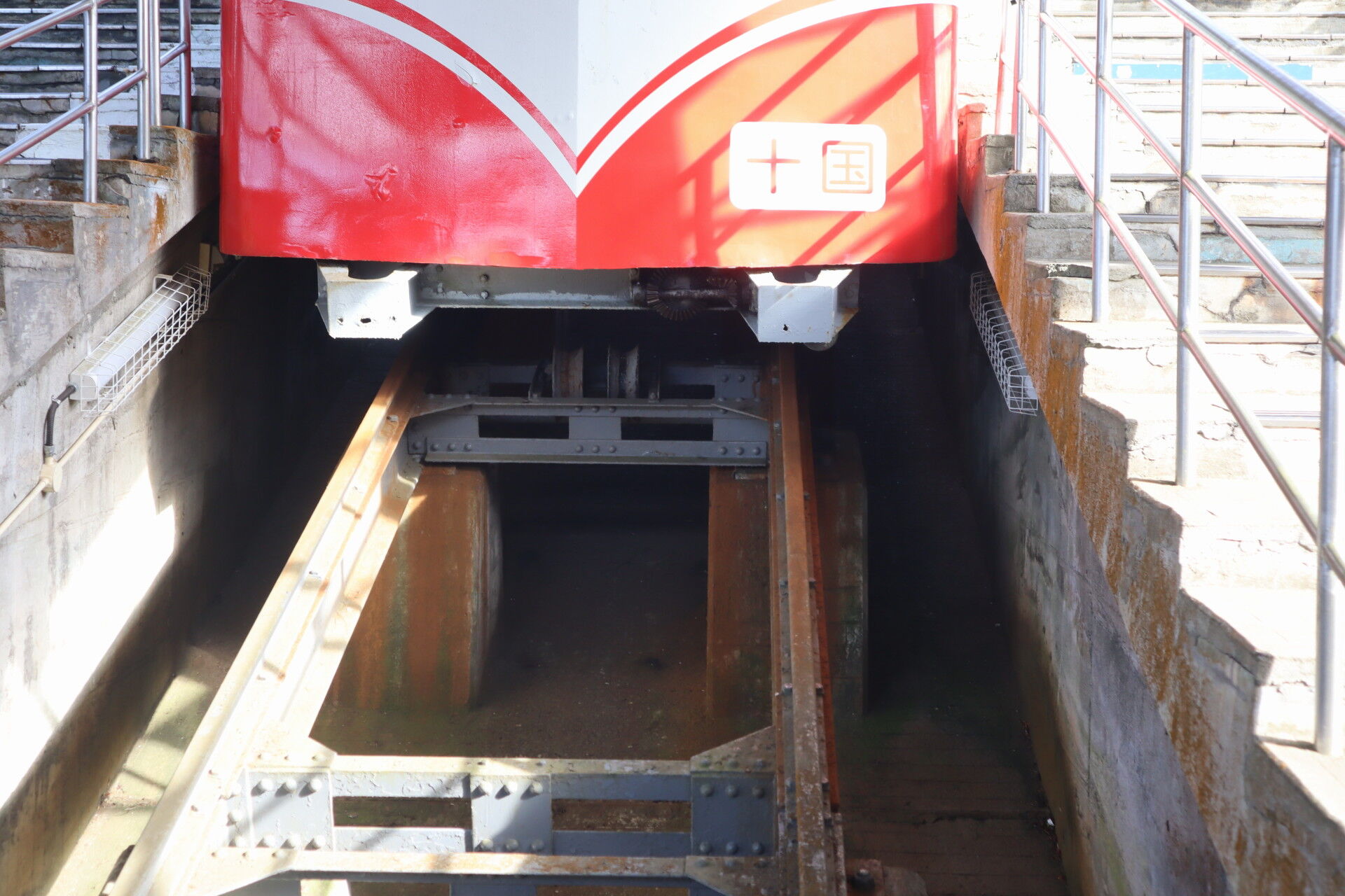 ケーブルカーの特徴である左右の車輪の違いが見えるケーブルカーですね。