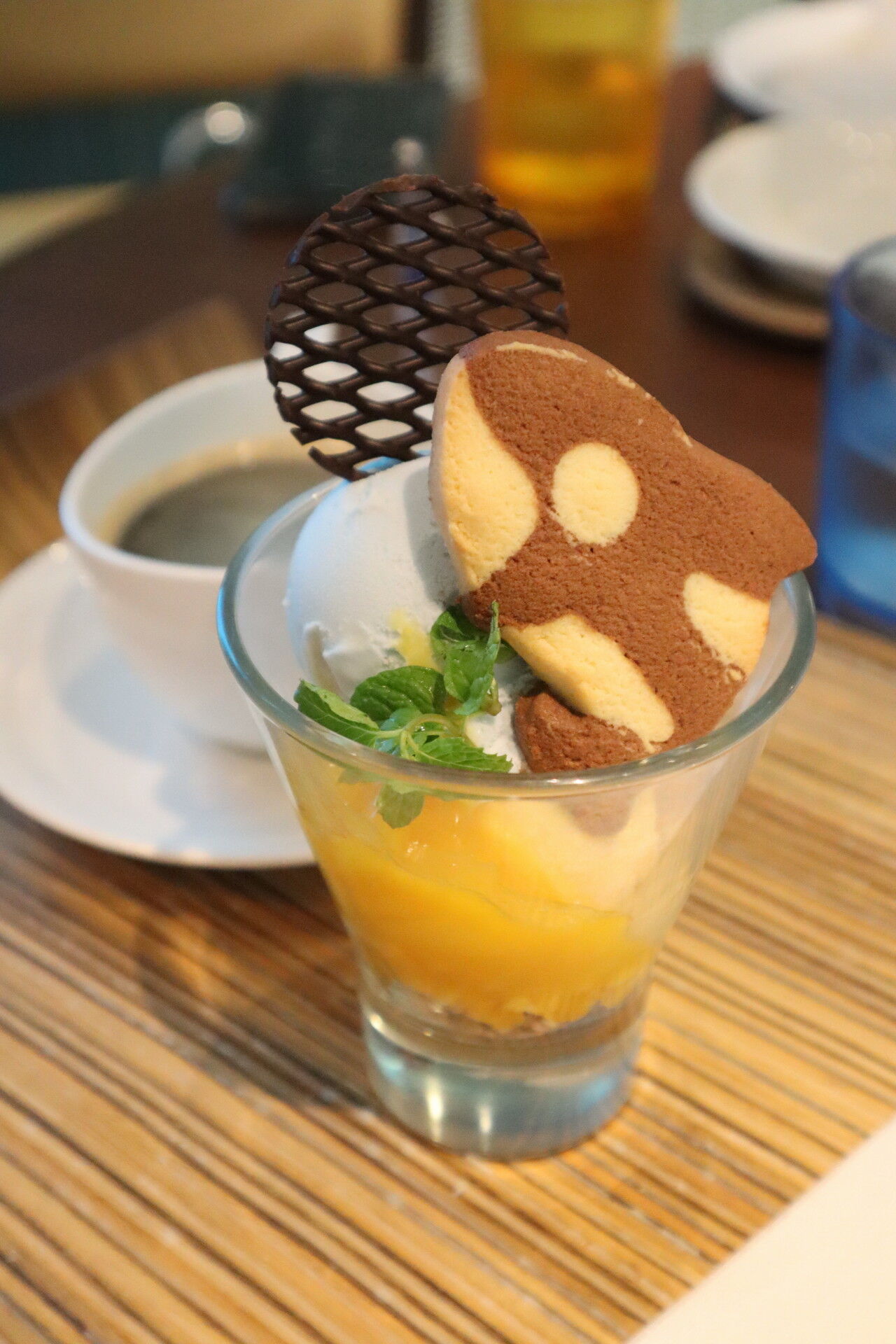 マンゴーゼリーとアイスクリーム、そしてシャチのクッキーが載っています。