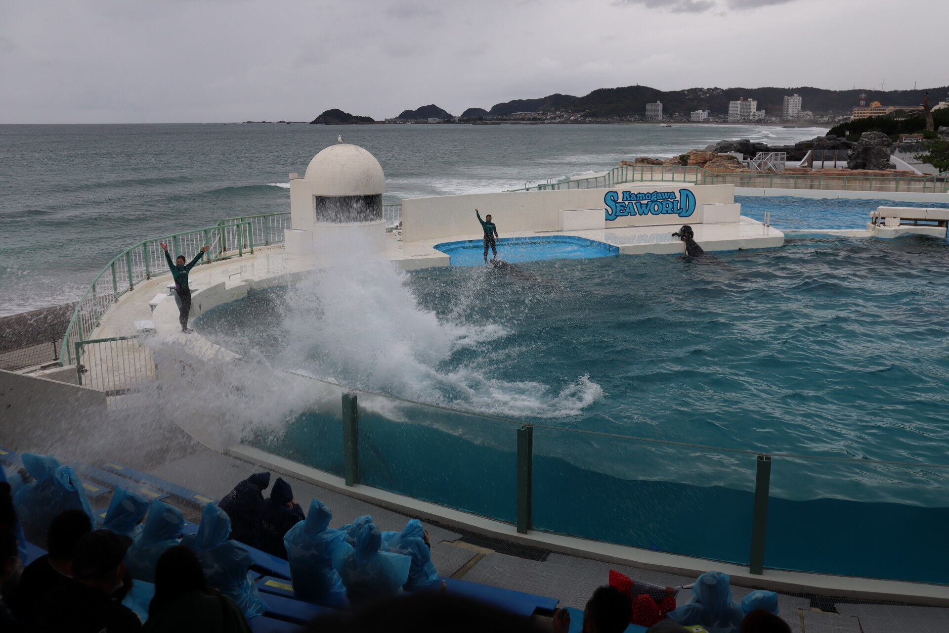 先程の物販はイルカショーの「水がかかってしまう可能性がある」の意味ではなくて