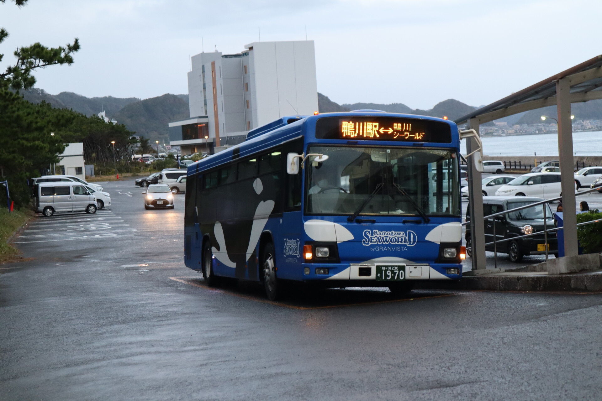 フェリーからマザー牧場とかに行くバスでしょうか? 日産ディーゼルRNという、江ノ電バスのこまわりくんで使われていた車種です。