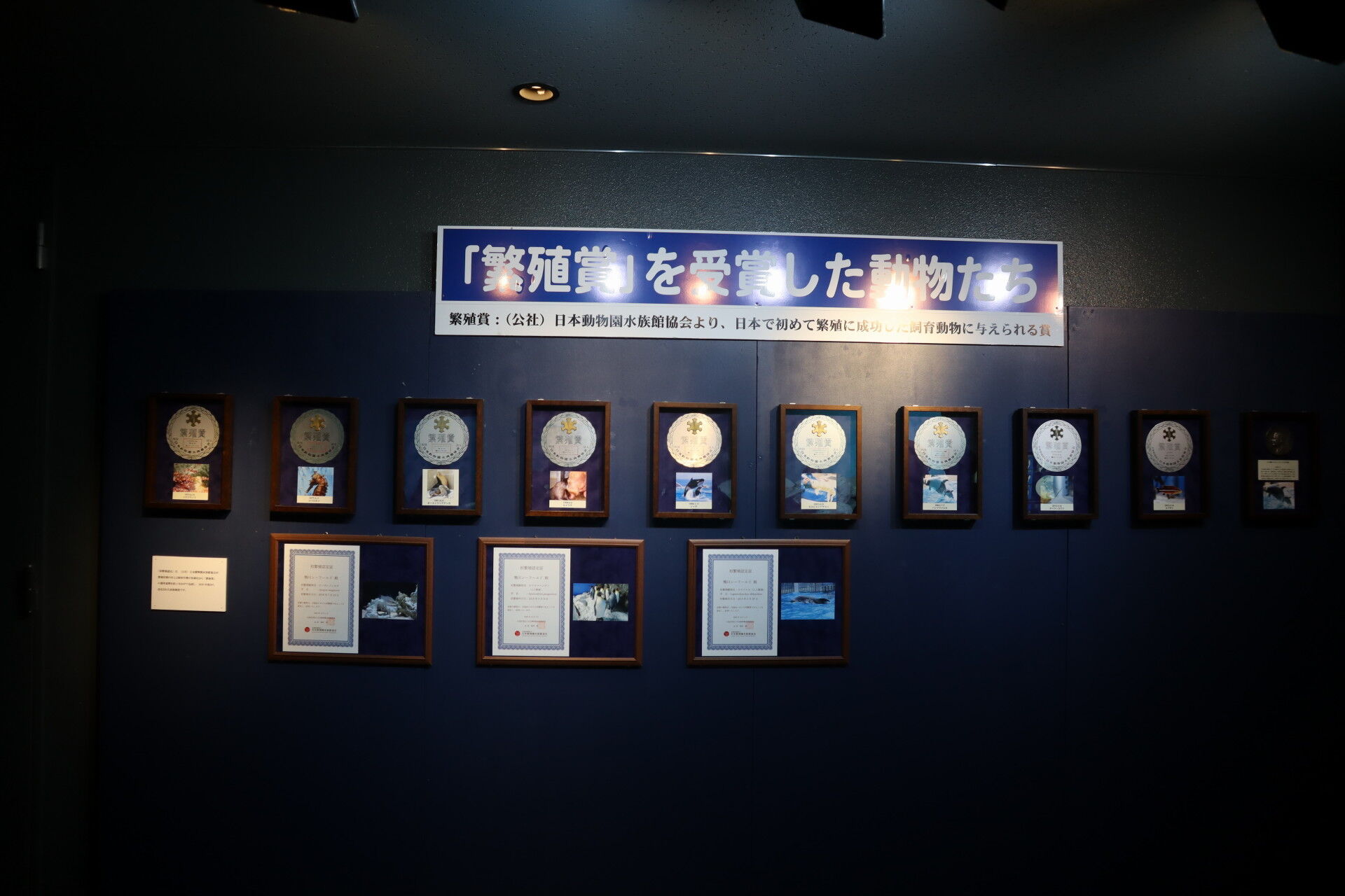 日本動物園水族館協会の繁殖賞のトロフィーが並んでいます。