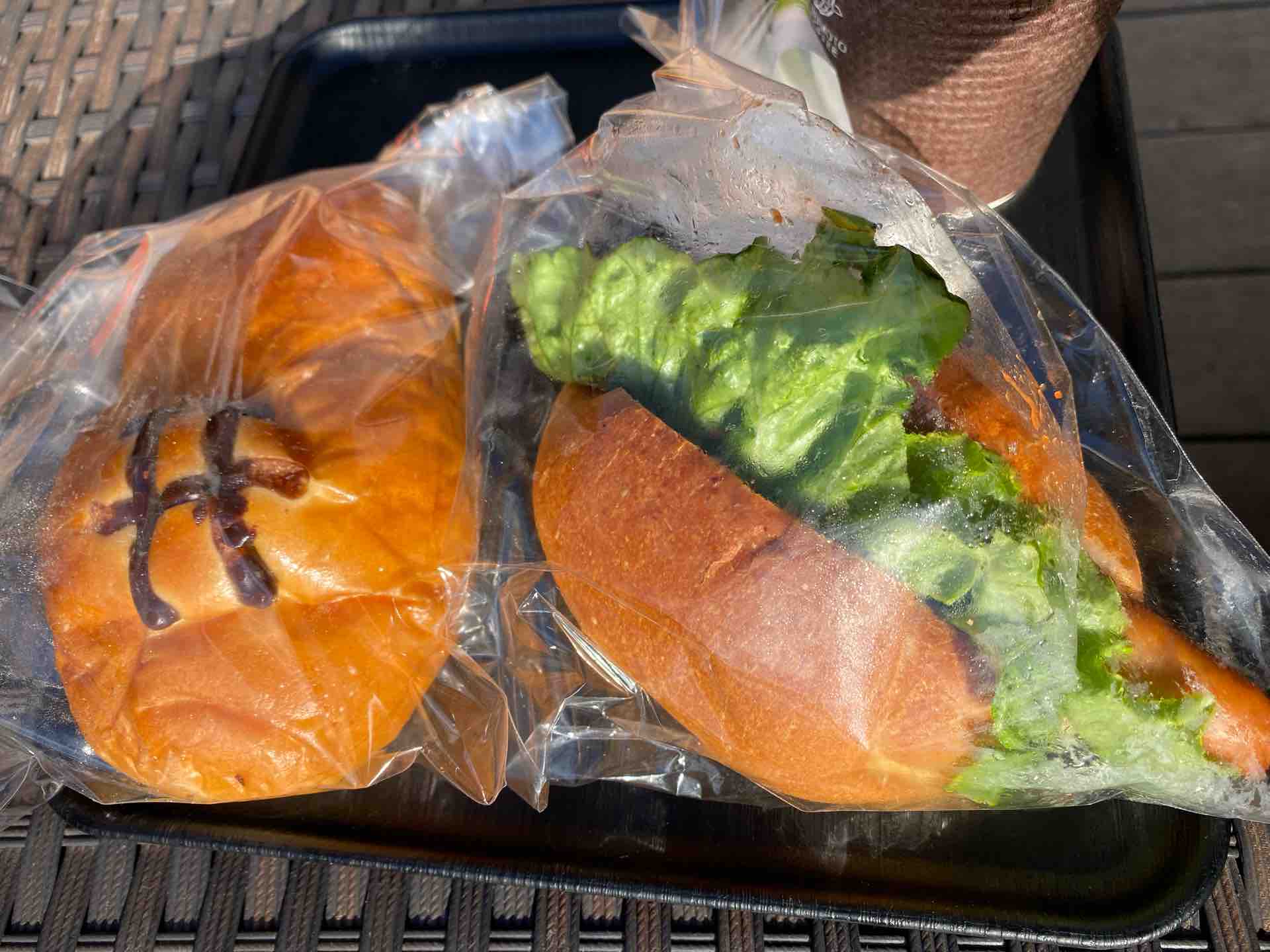 一碧湖あんぱんは湖の形と鳥居をイメージしたあんぱん、そして湖に浮かぶボートをイメージしたボートドッグです。