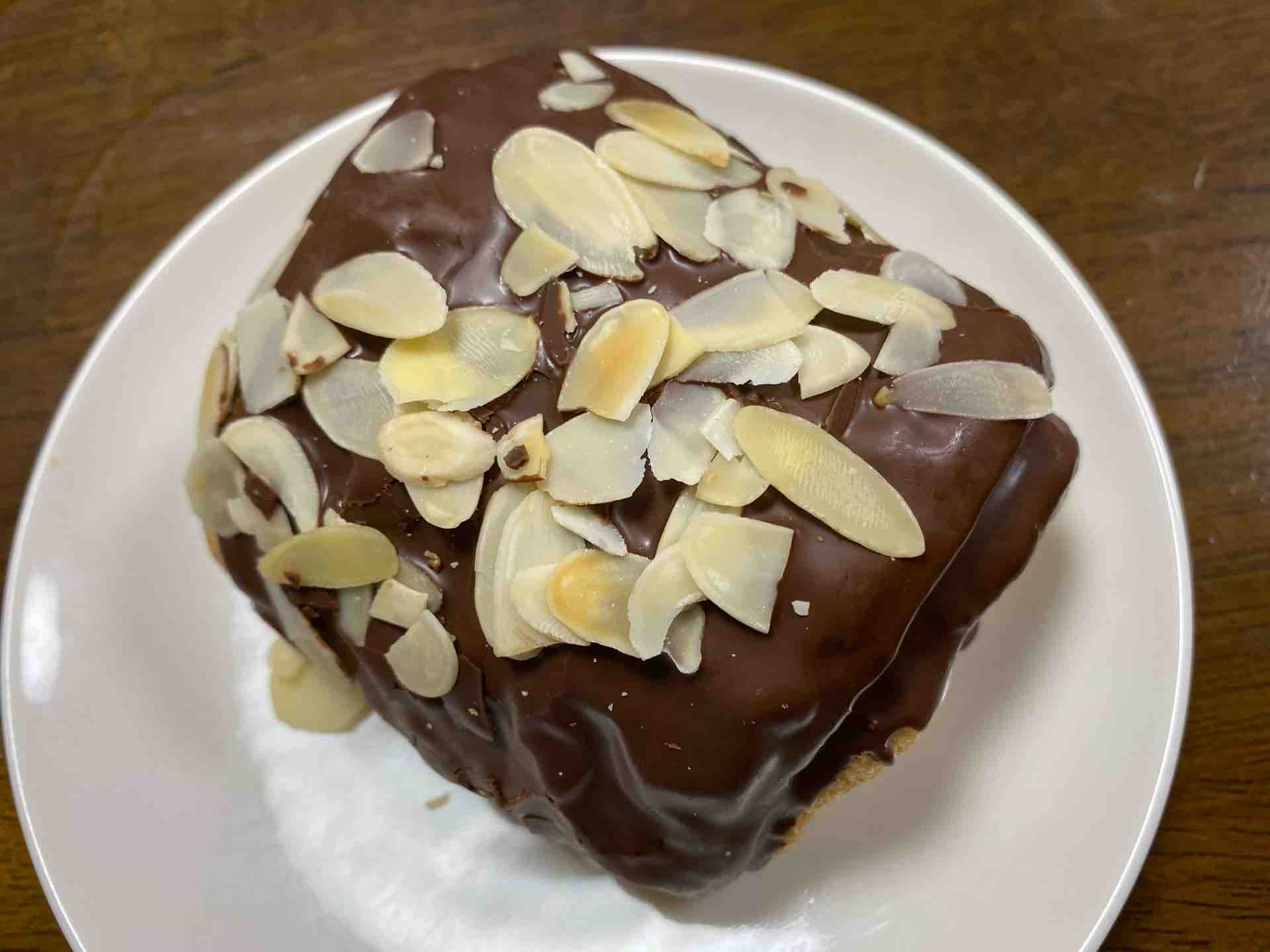 デニッシュにベルギー産バトンチョコを包み、アーモンドを乗せたもの。