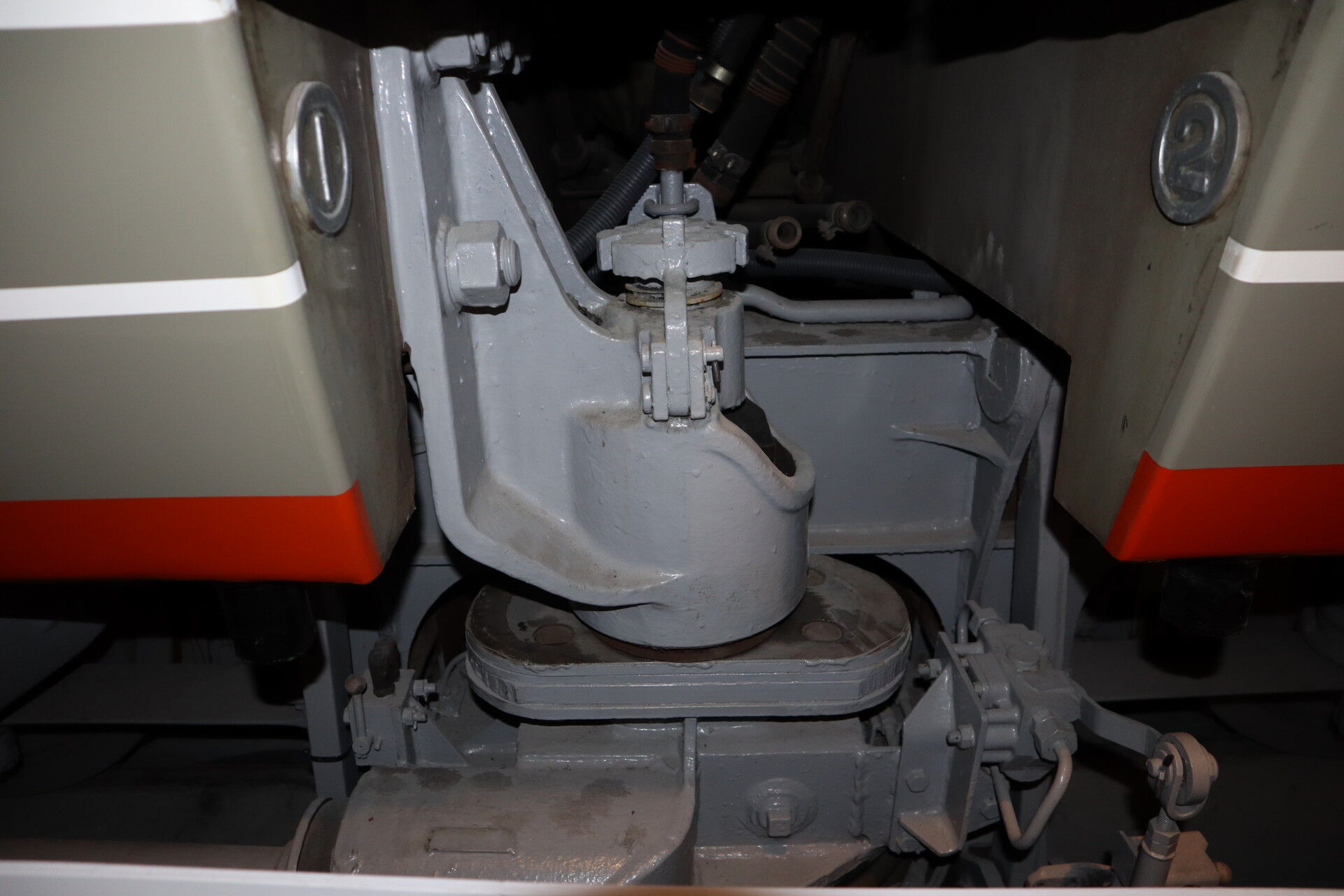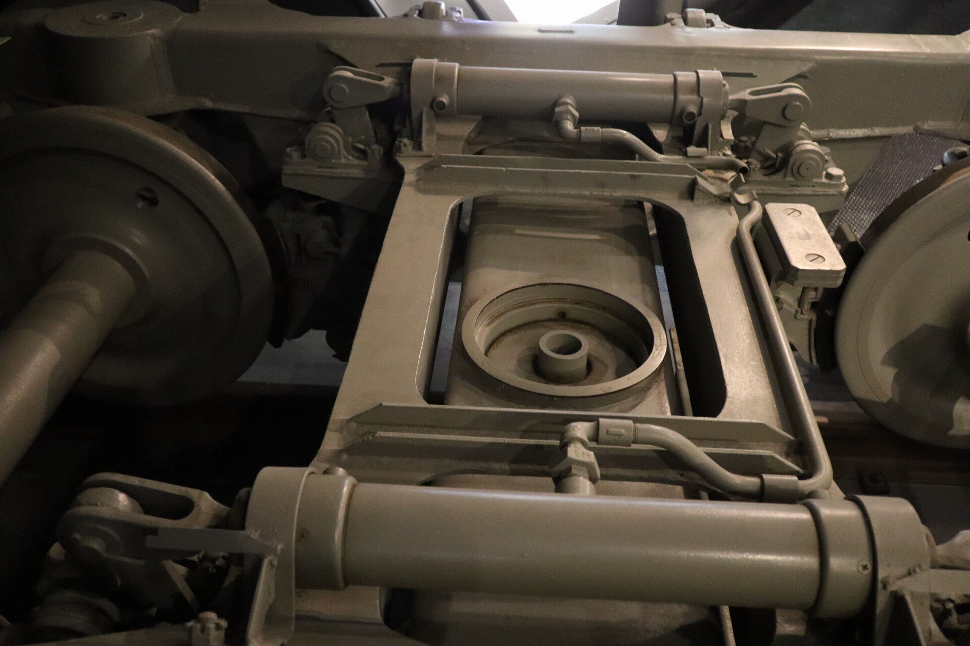 連接台車の中心にあるのが心皿、反対側の車両の中心ピンが載ります。