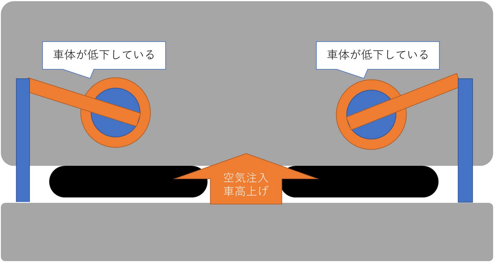 VSEは、この高い空気バネの空気圧を調整することで、車体傾斜を実現しています。