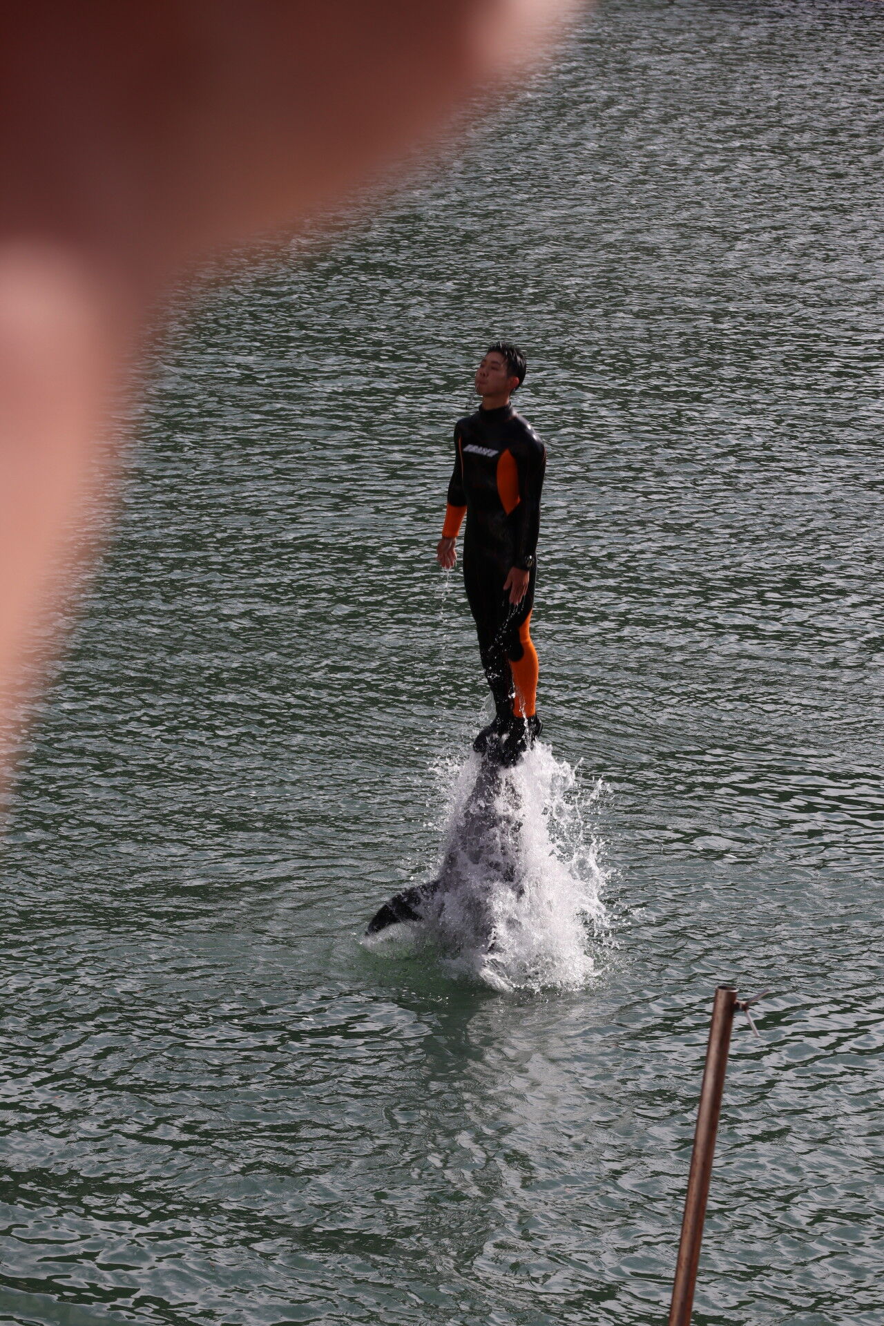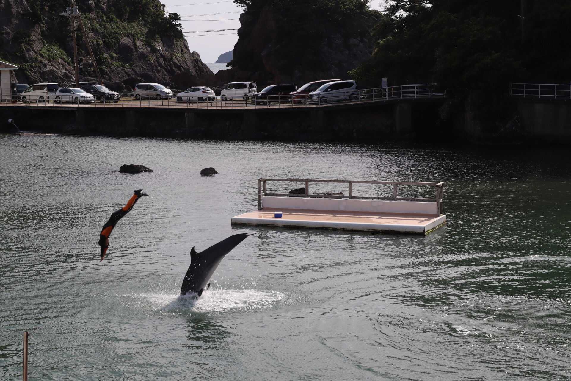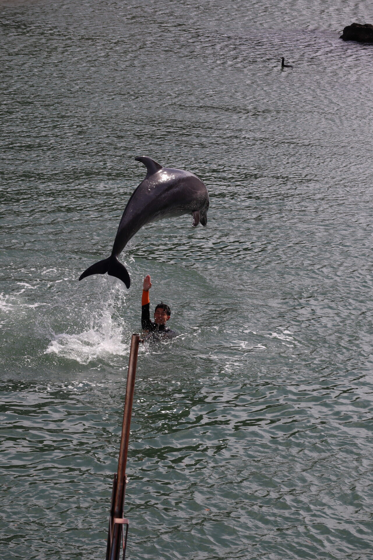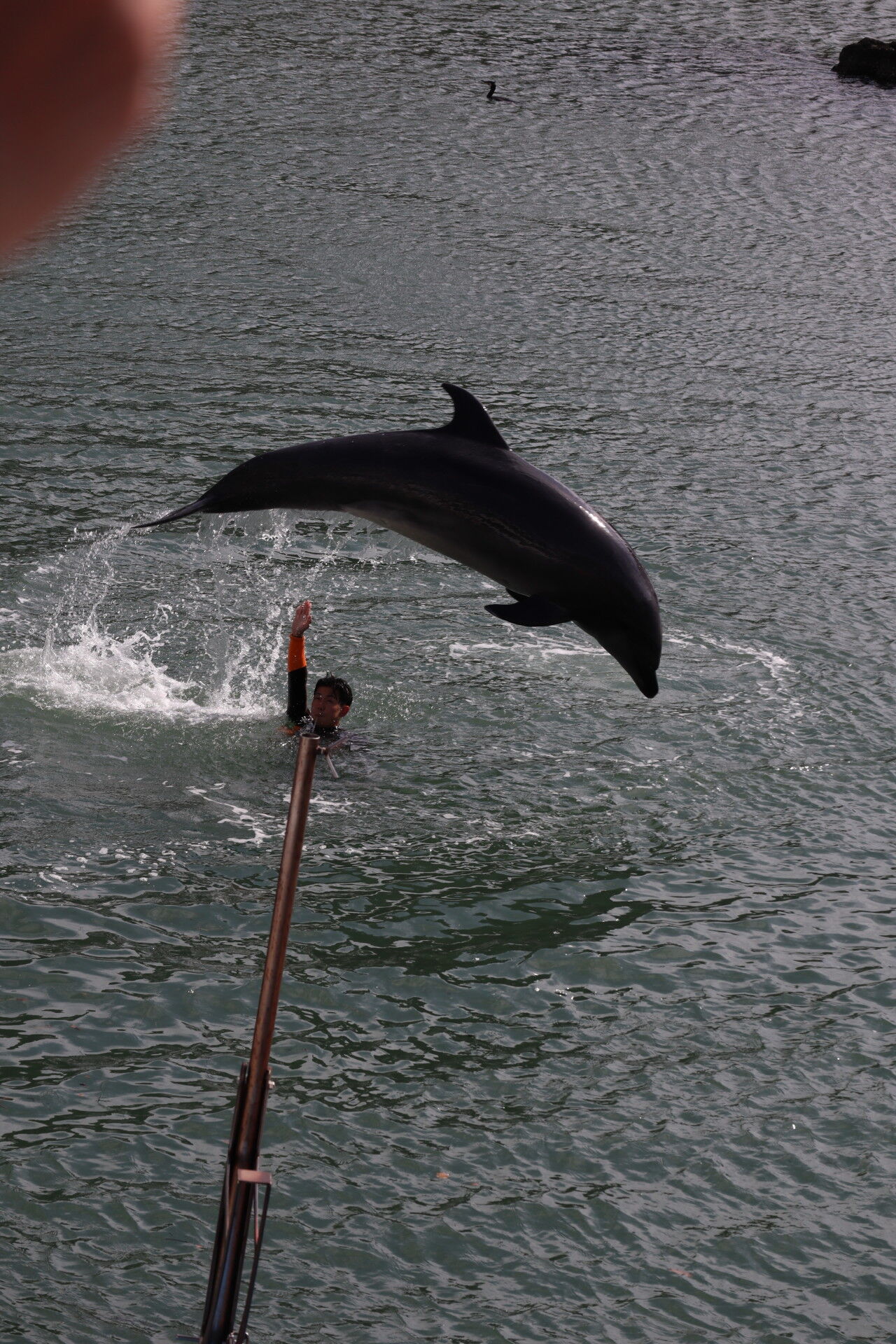 トレーナーの上をジャンプで超えていくイルカ。
