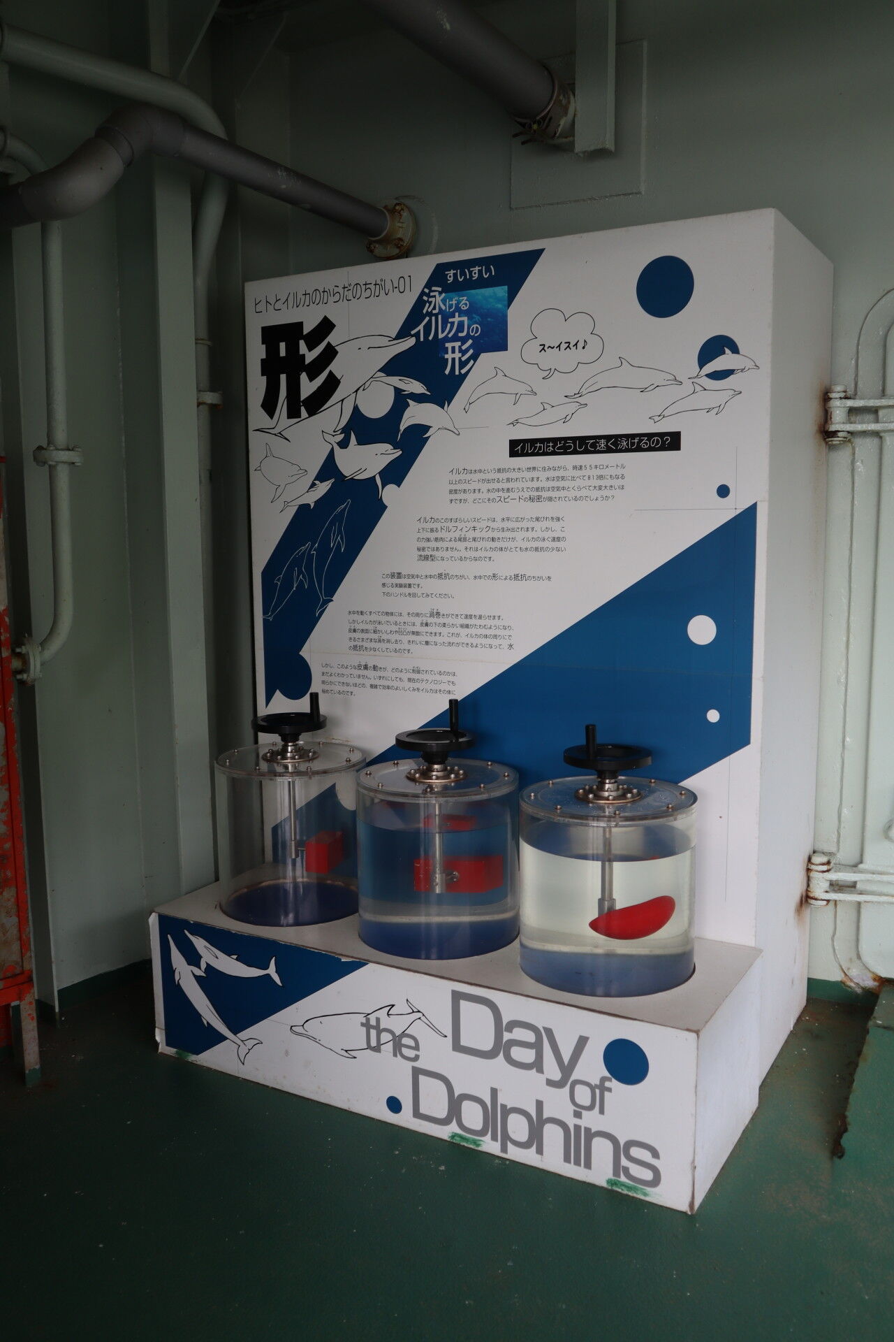 イルカの身体は流線形をしていて、四角い物体を水の中でくるくる回すと水がかき回されて抵抗が激しい一方、流線形は水面に影響を及ぼしにくく、回り出すとすいっと滑るように動きます。こういう物理的特徴がイルカを泳ぎの達人にしているのですね。