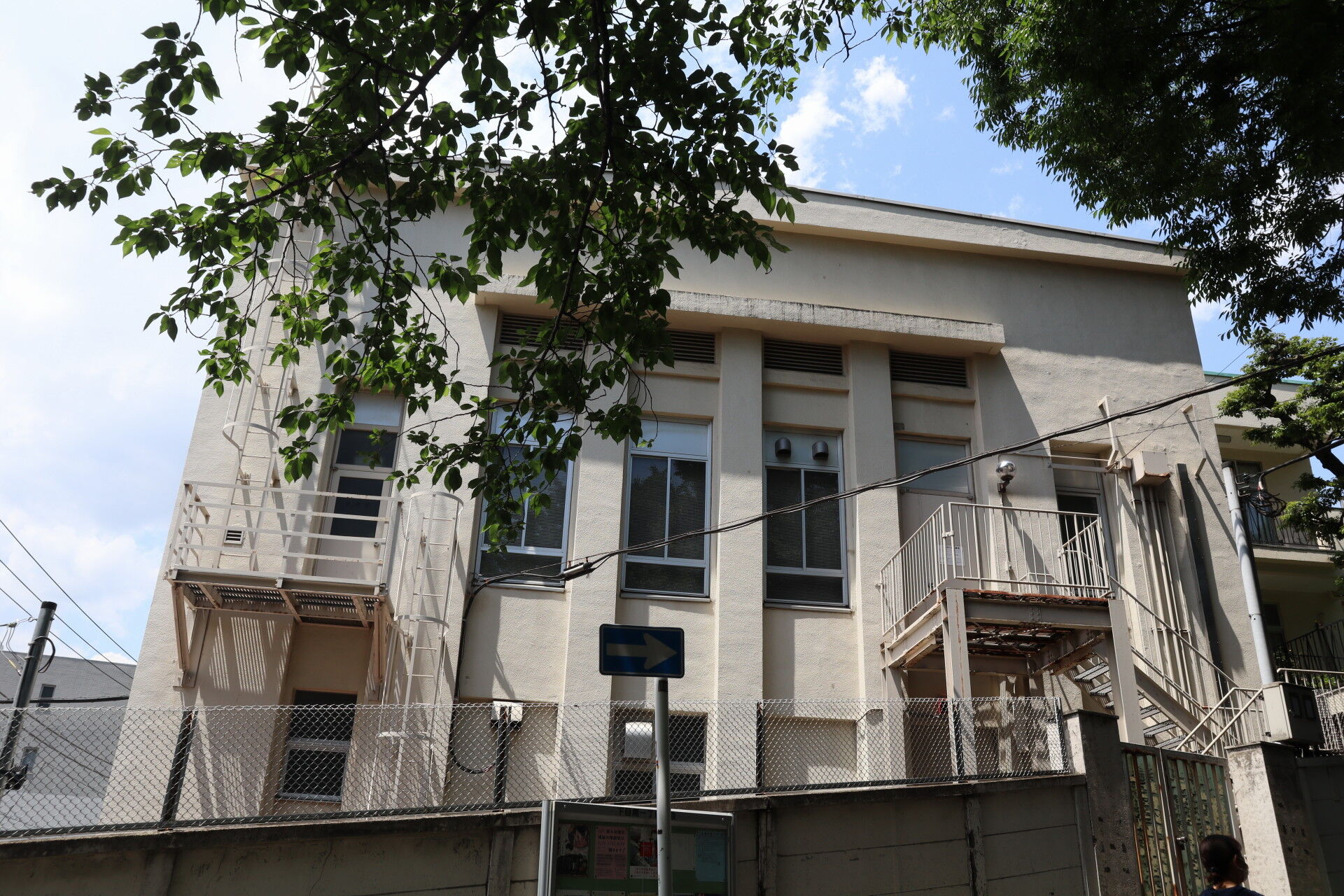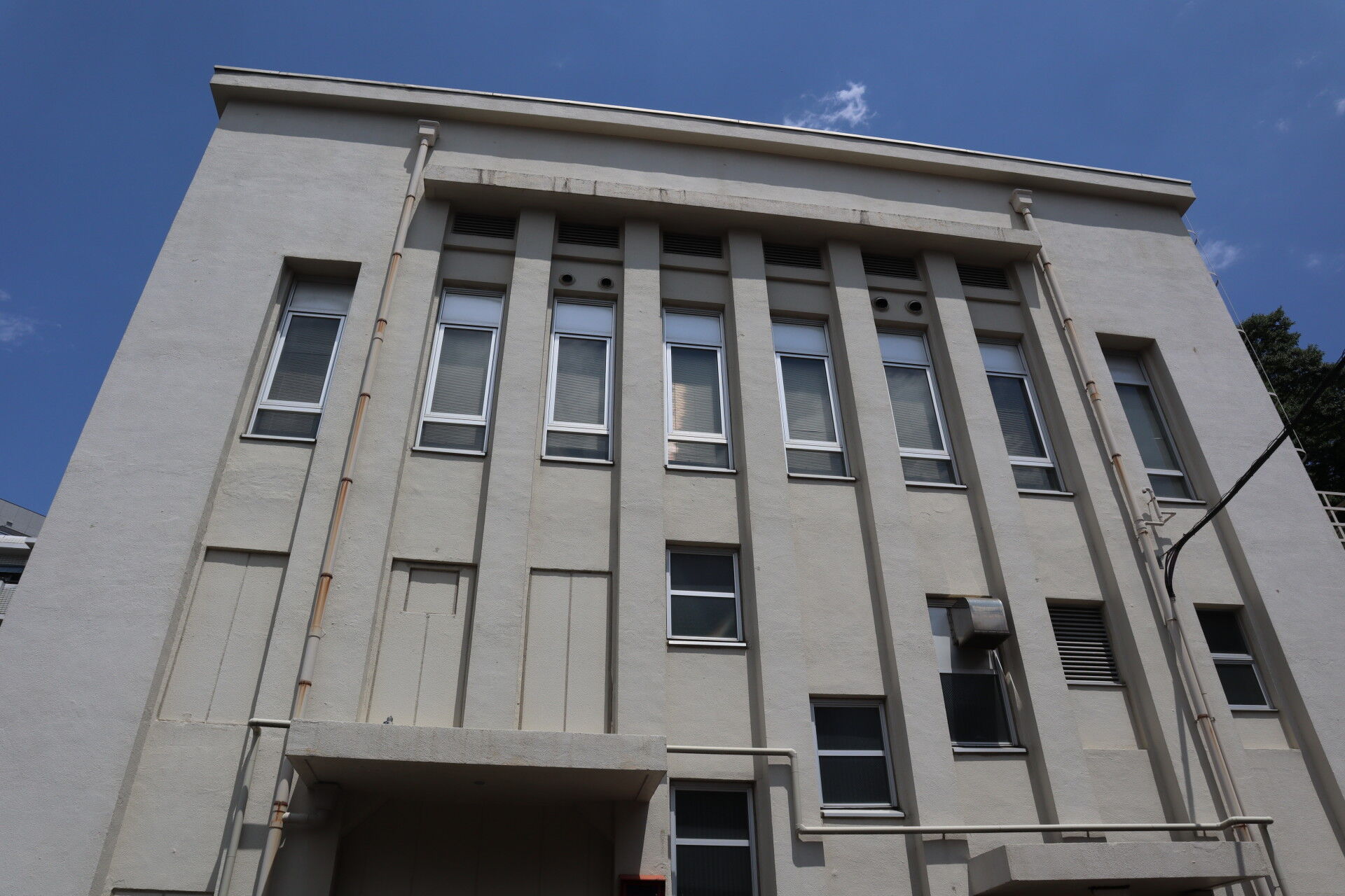 中央部にはヒサシ、1階の不連続な窓はおそらく階段室、左側の窓は埋められているのでしょうか。