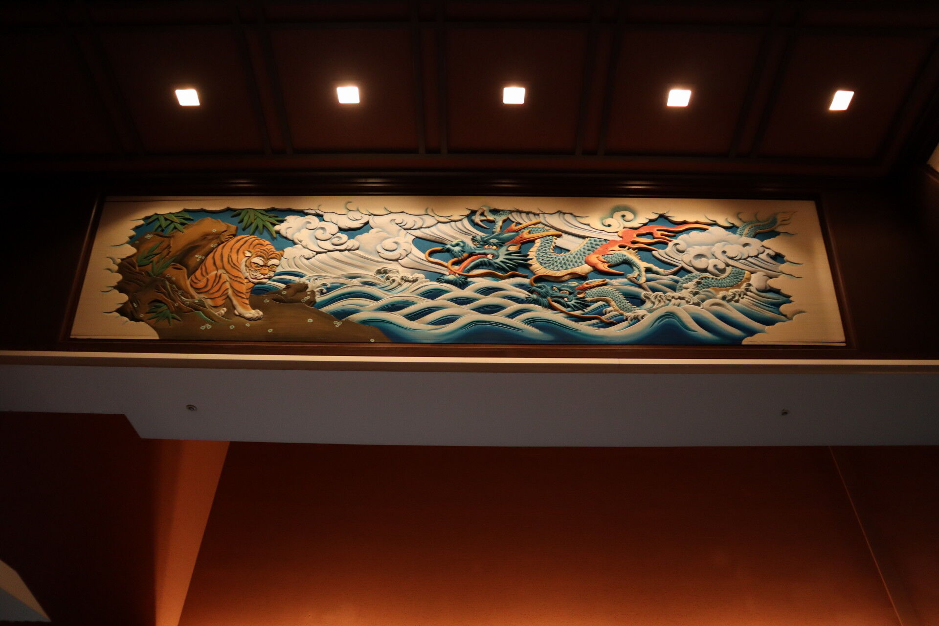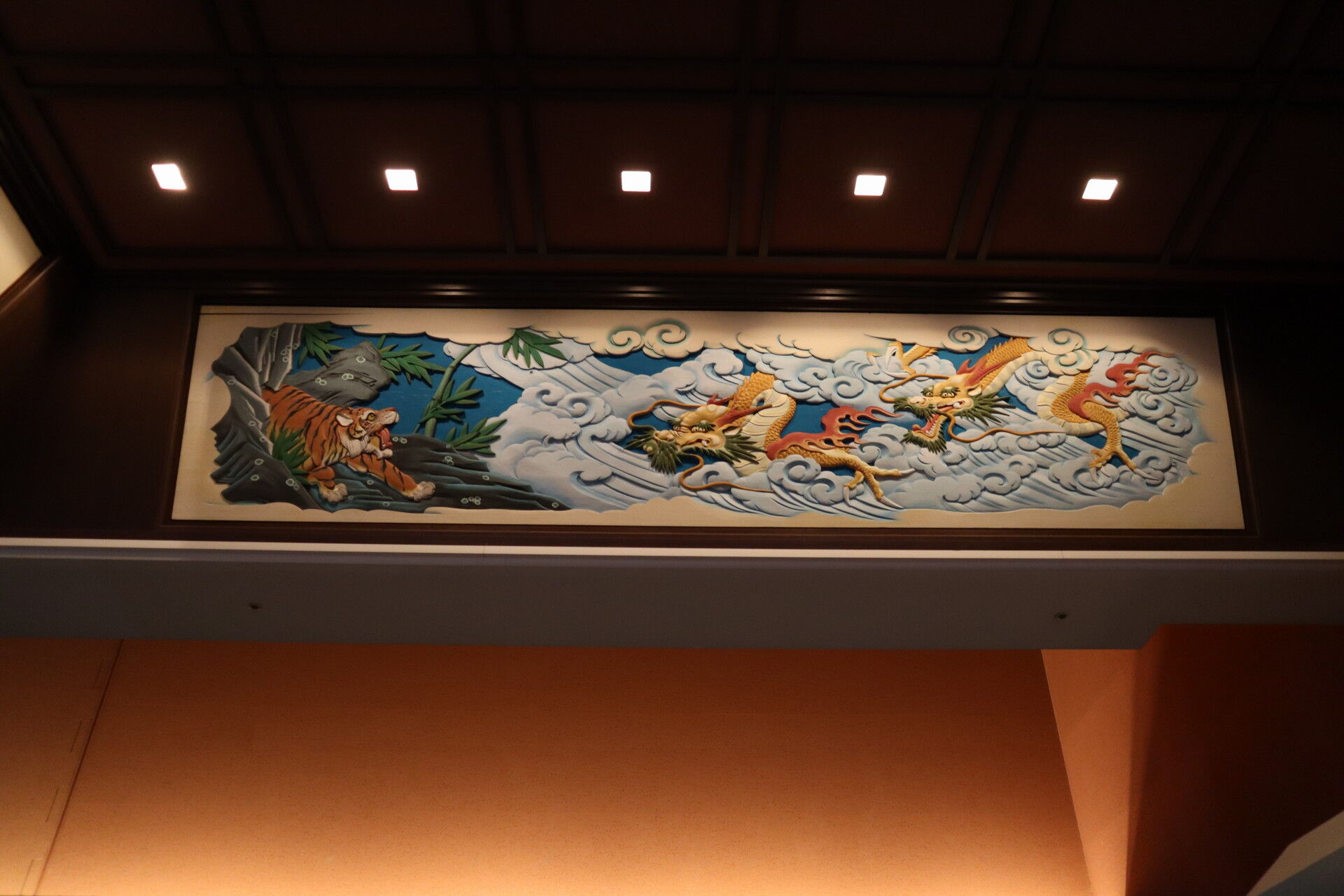 通路にはかつての雅叙園から移設してきたという木彫りの絵が並びます。