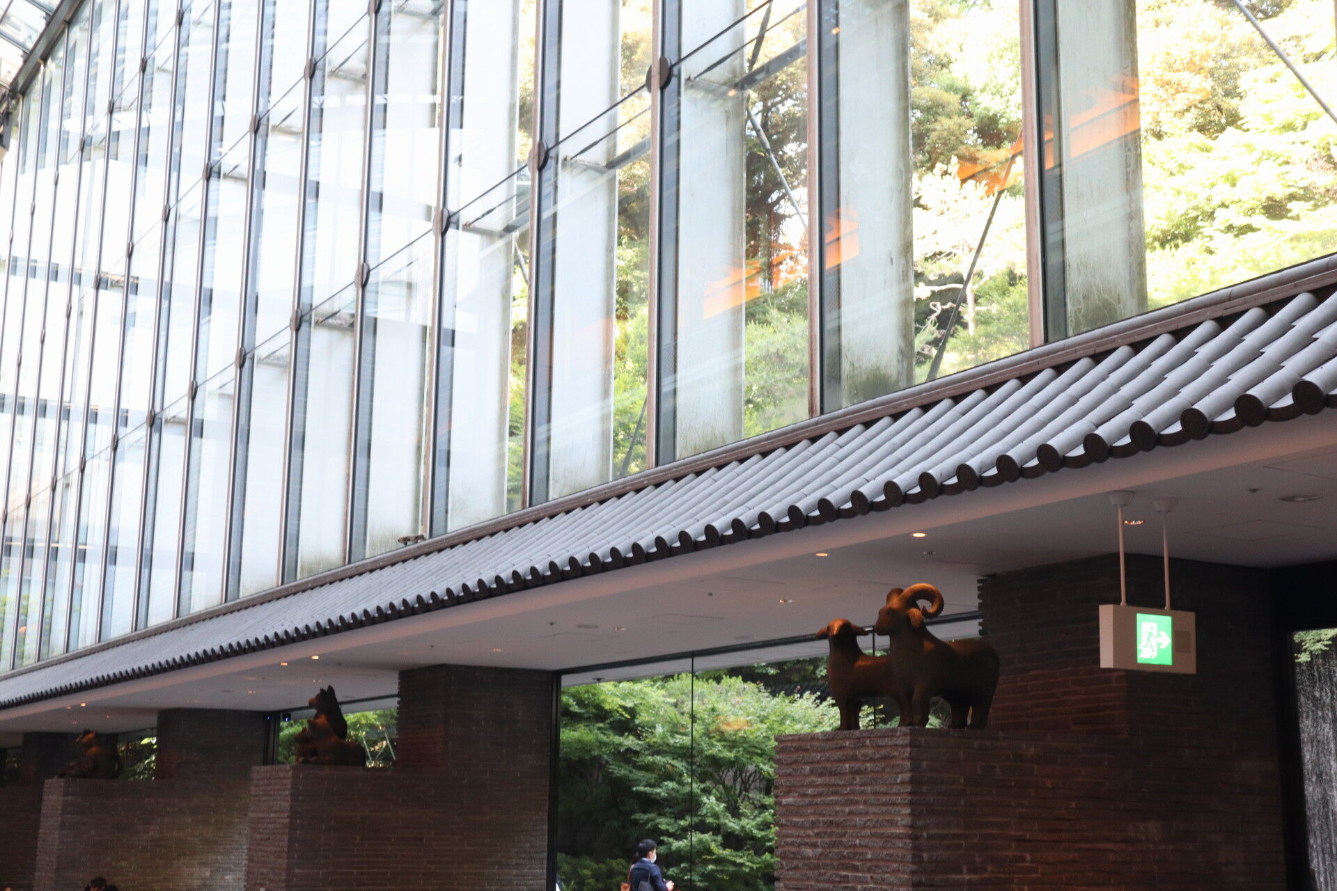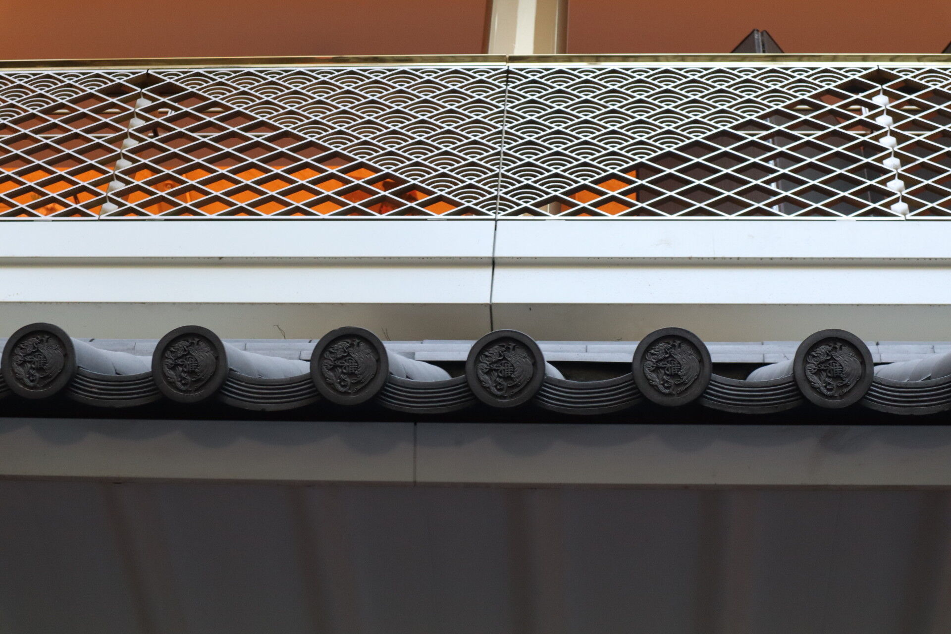 雅叙園のマークが並ぶ屋根瓦が建物の中にあります。