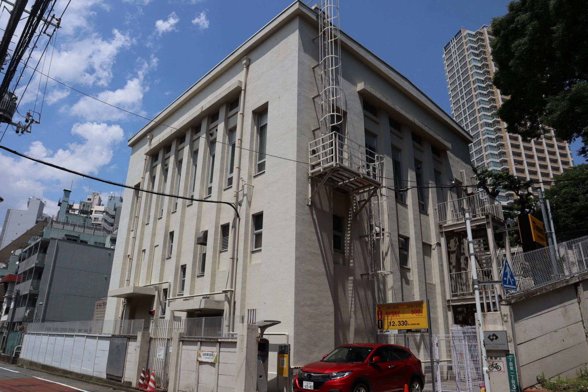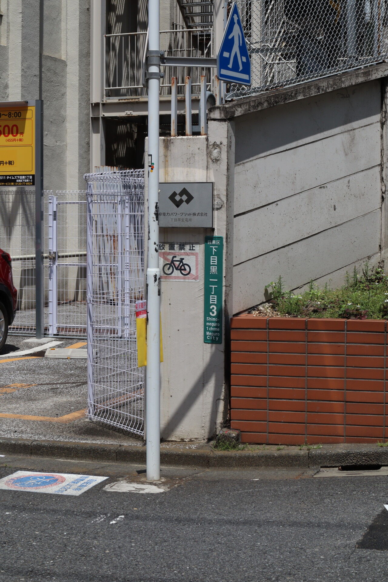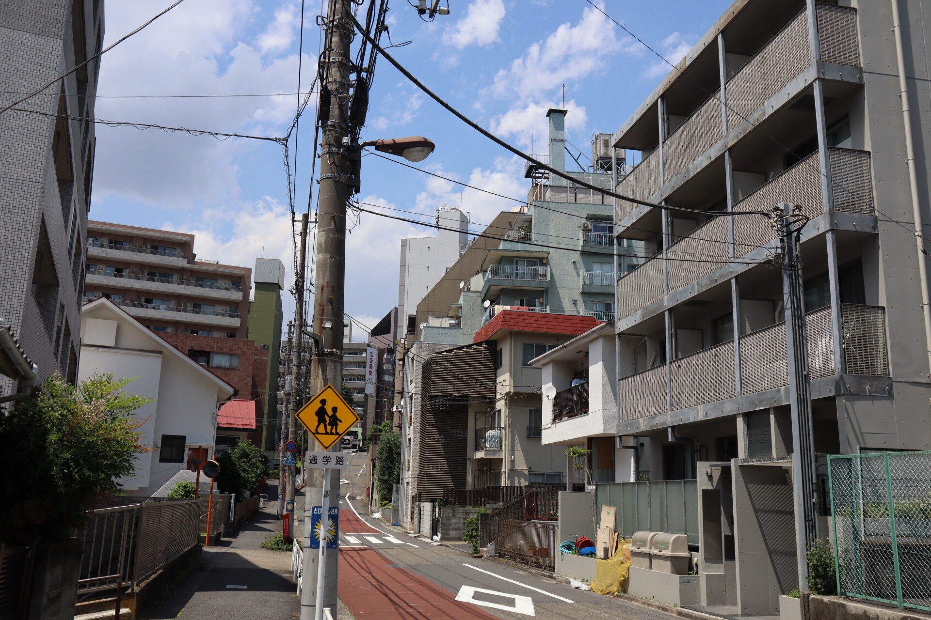 目黒川によって作られた谷に、斜めに切られた建物が並ぶ光景。