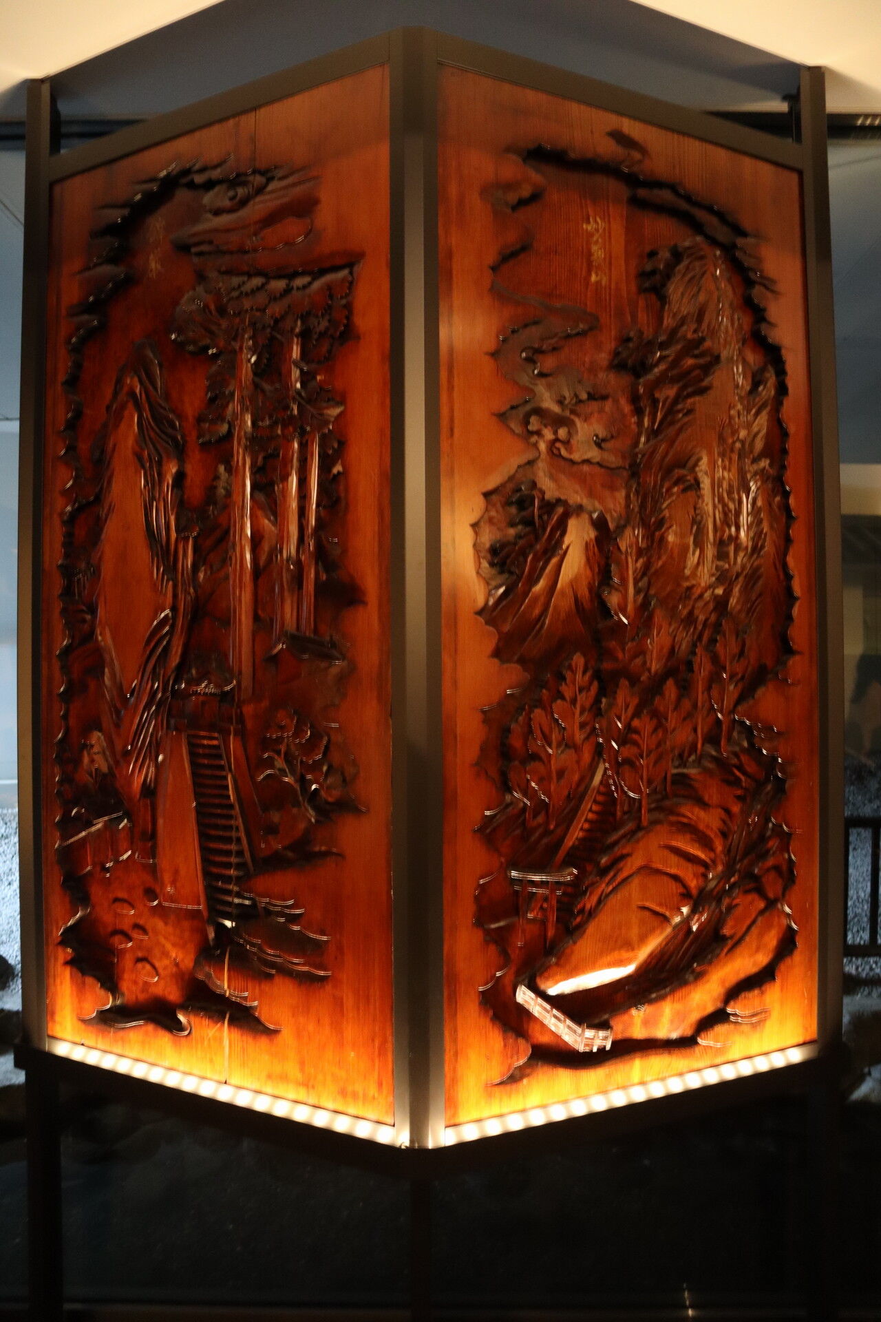 木彫りの風景画が並びます。これも旅館からの伝承部材。