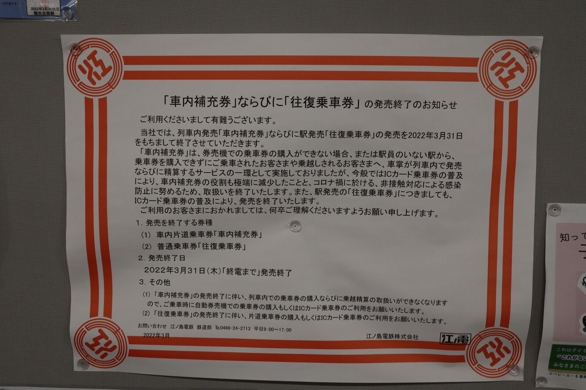 3月末をもって車内補充券と往復乗車券が発売終了となりました。
