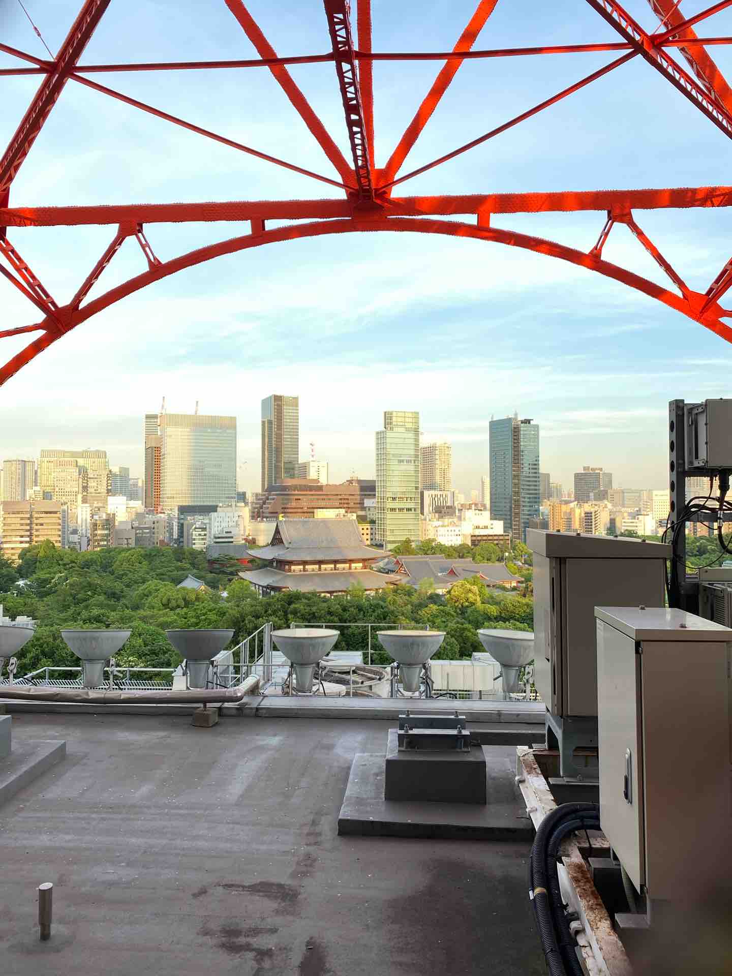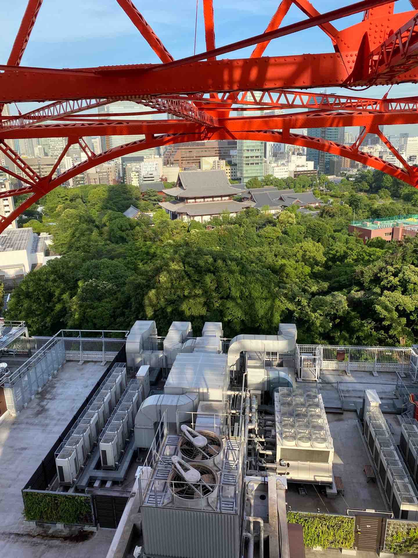 フットタウン屋上に大量に並んだ室外機の向こうに、増上寺が見えます。