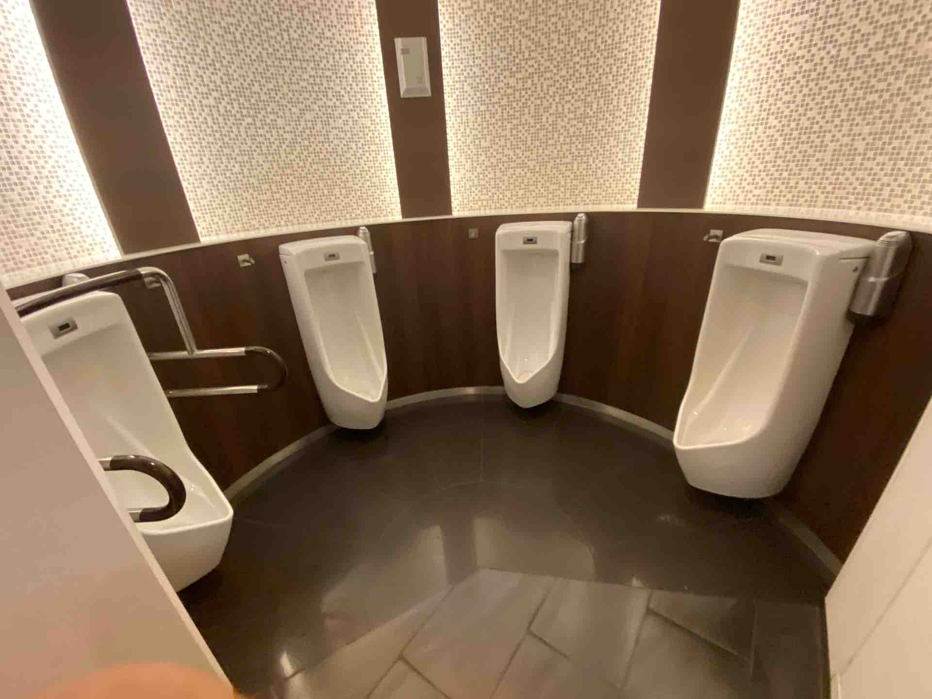 小便器を扇型に配置して中央に手洗い場というなかなか新しいスタイル。
