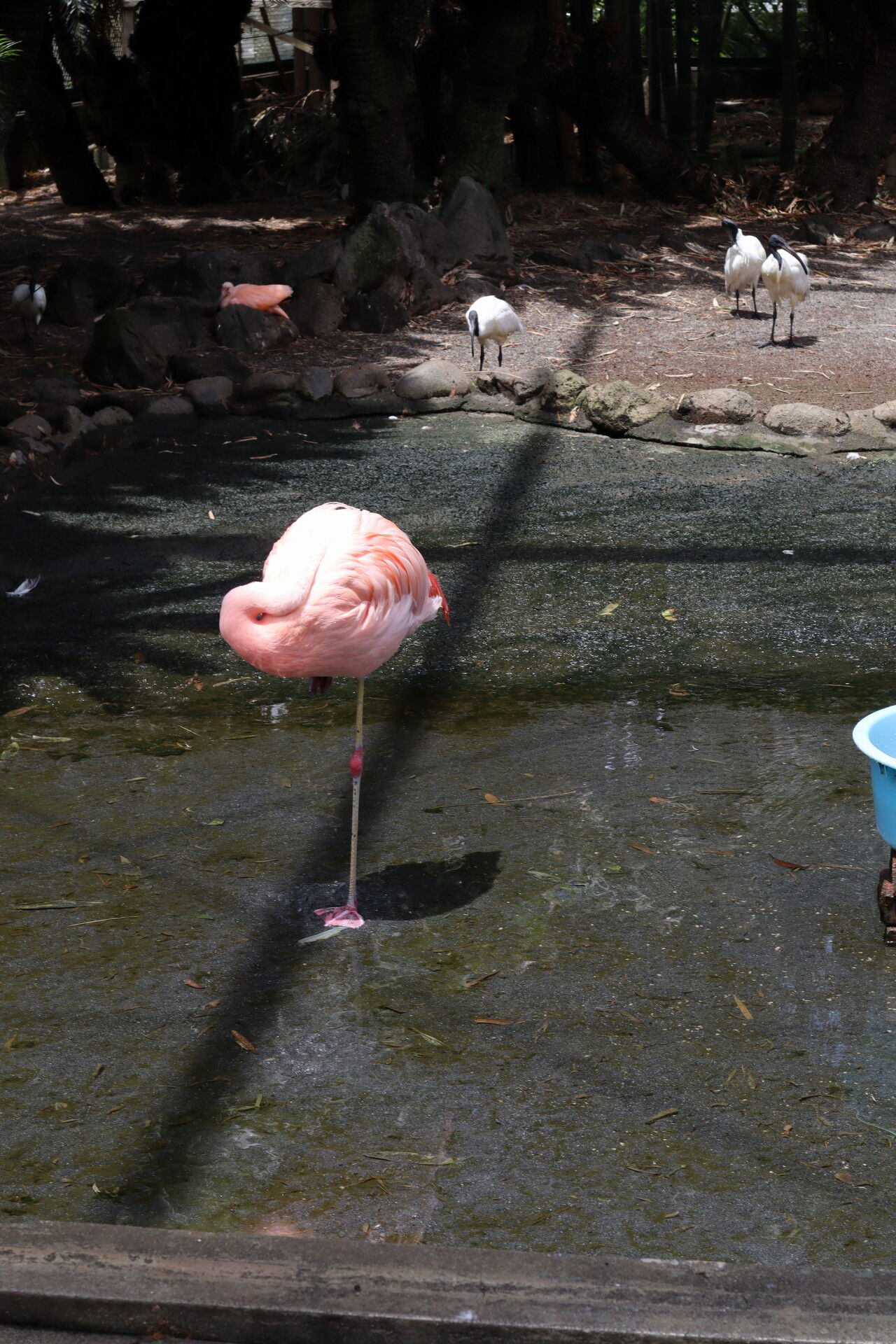 フラミンゴです。体温を逃さないように片足で立つと言われていますが、今日だいぶ暑いですよ…大丈夫かな。