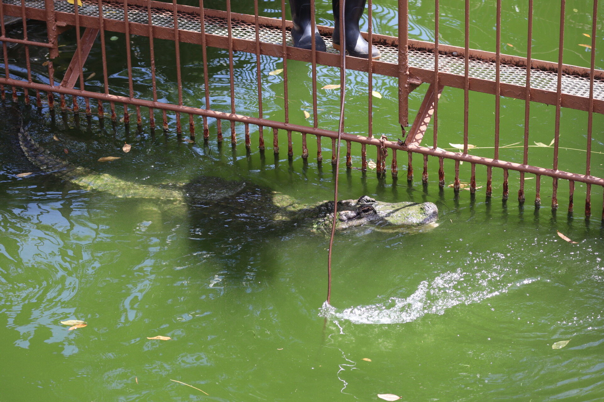 マジに入ってます。2人1組でワニのいる柵の中に入って餌やり。この仕事すごい。