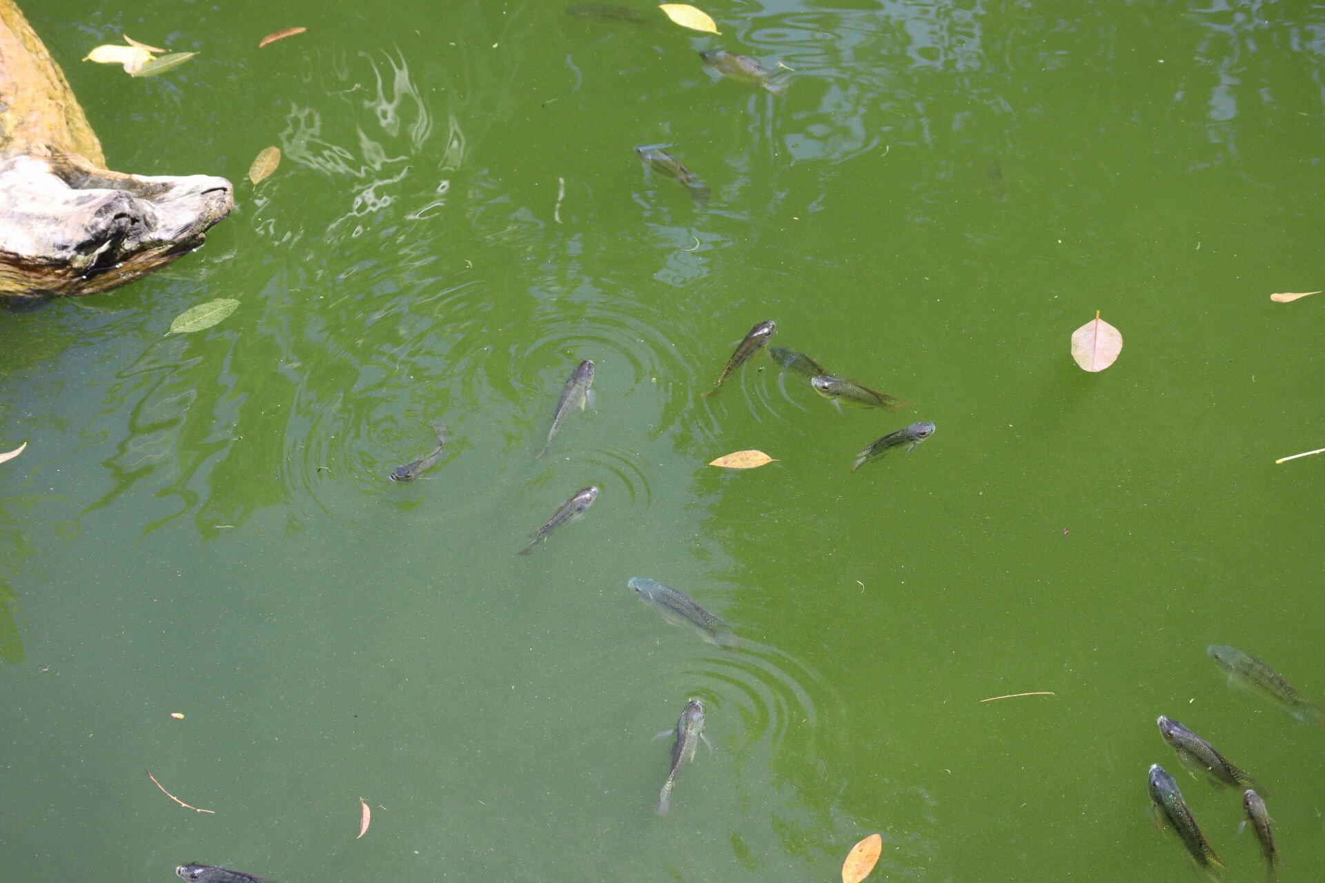 ティラピアでしょうか?魚がたくさん集まっています。なんかおこぼれがもらえるんでしょうかね?
