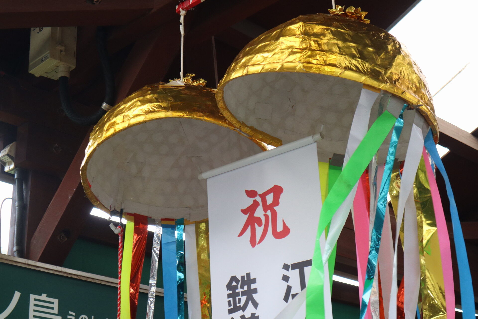 脚立に登ってホーム上屋に巨大なくす玉を取り付けていました。