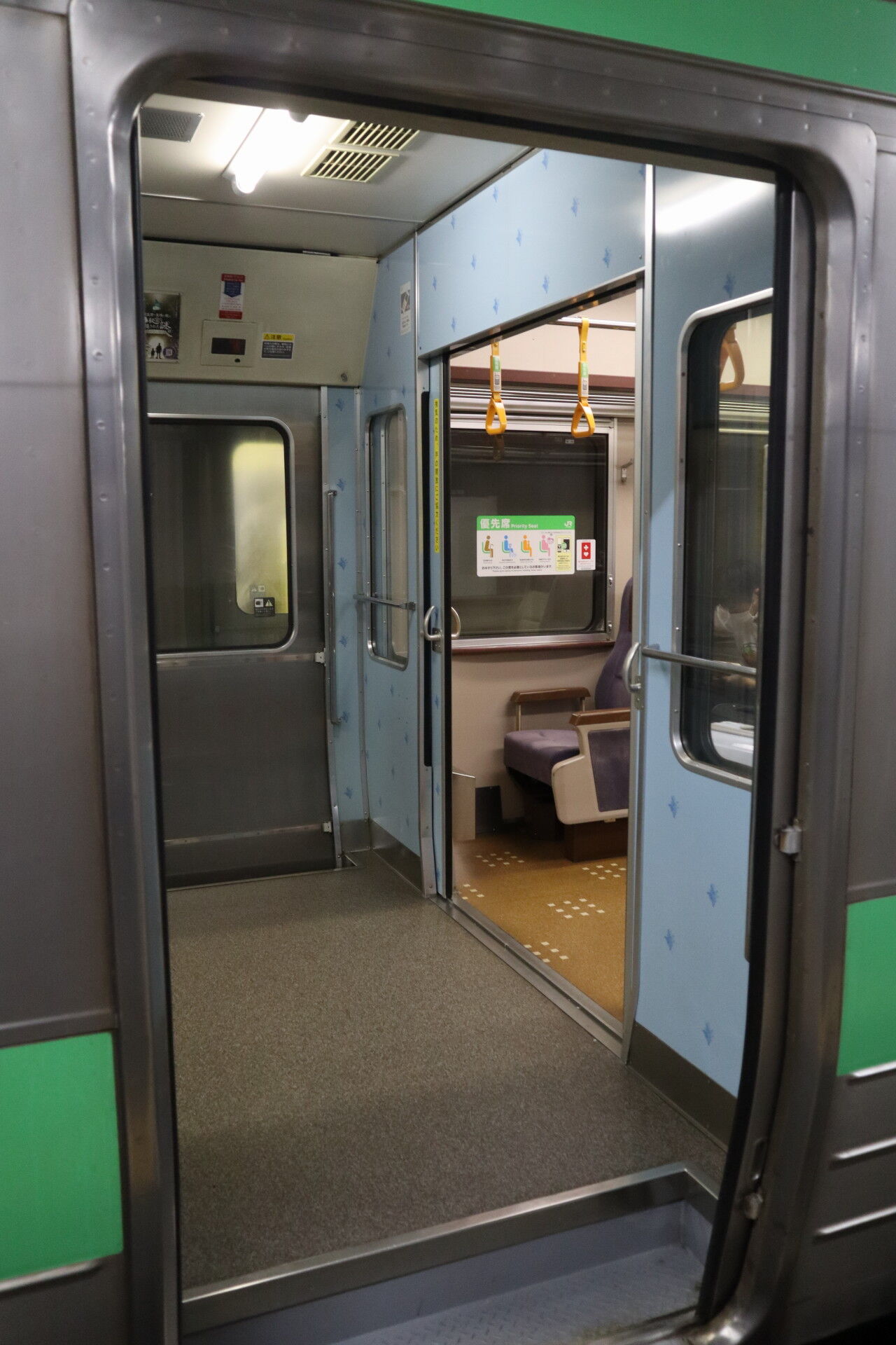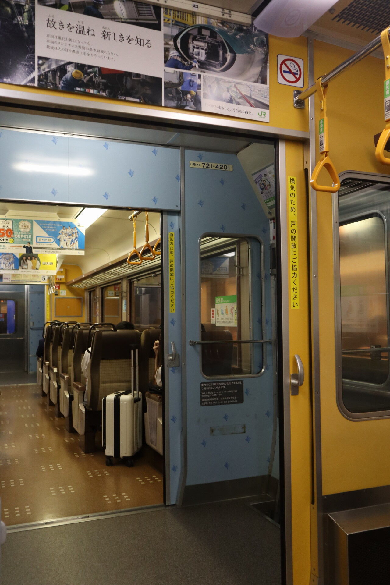 客車列車の跡を継いだ711系はデッキ付き2ドアで乗り降りに問題があり、デッキ付き転換クロス3ドアになったのがこの721系。しかし転換クロスはシートピッチの関係上スーツケースが狭い通路に滞留して乗り降りが不便になるため、その後の車両からはデッキやロングシートがなくなってきました。