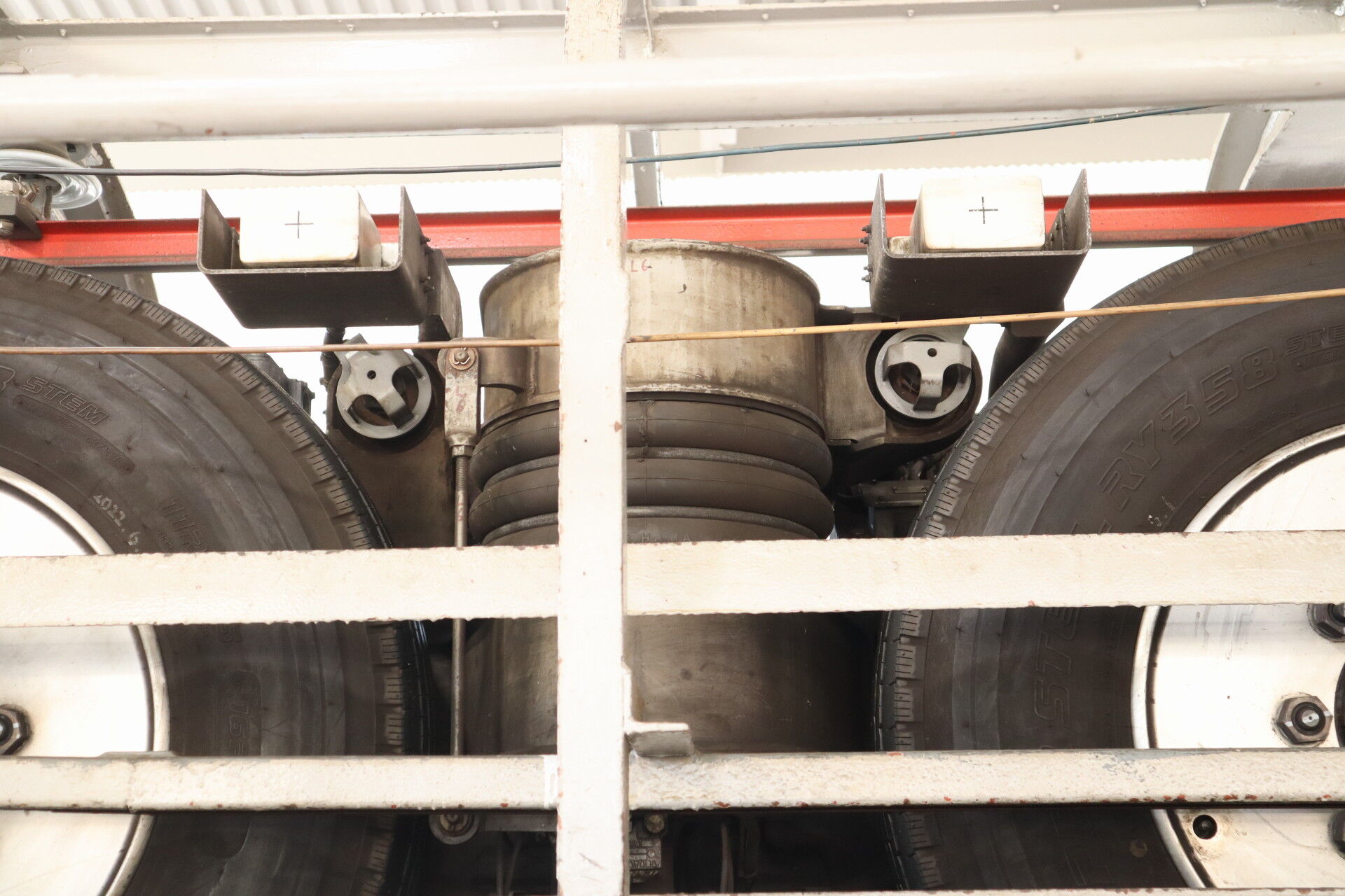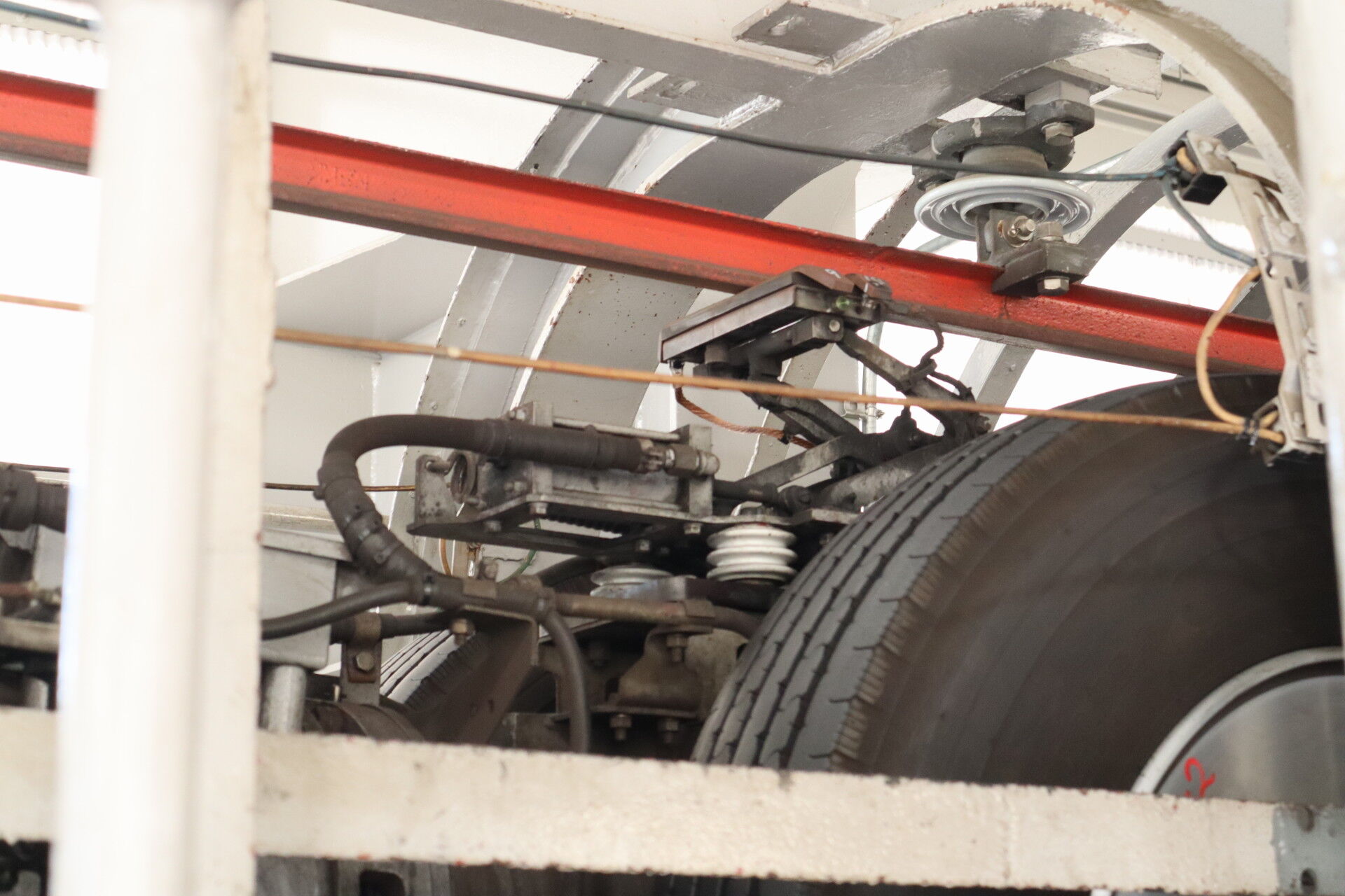 懸垂式モノレールとはいえ、台車構造は電車と同じで、空気バネで枕梁を支え、枕梁から車体を吊るしています。