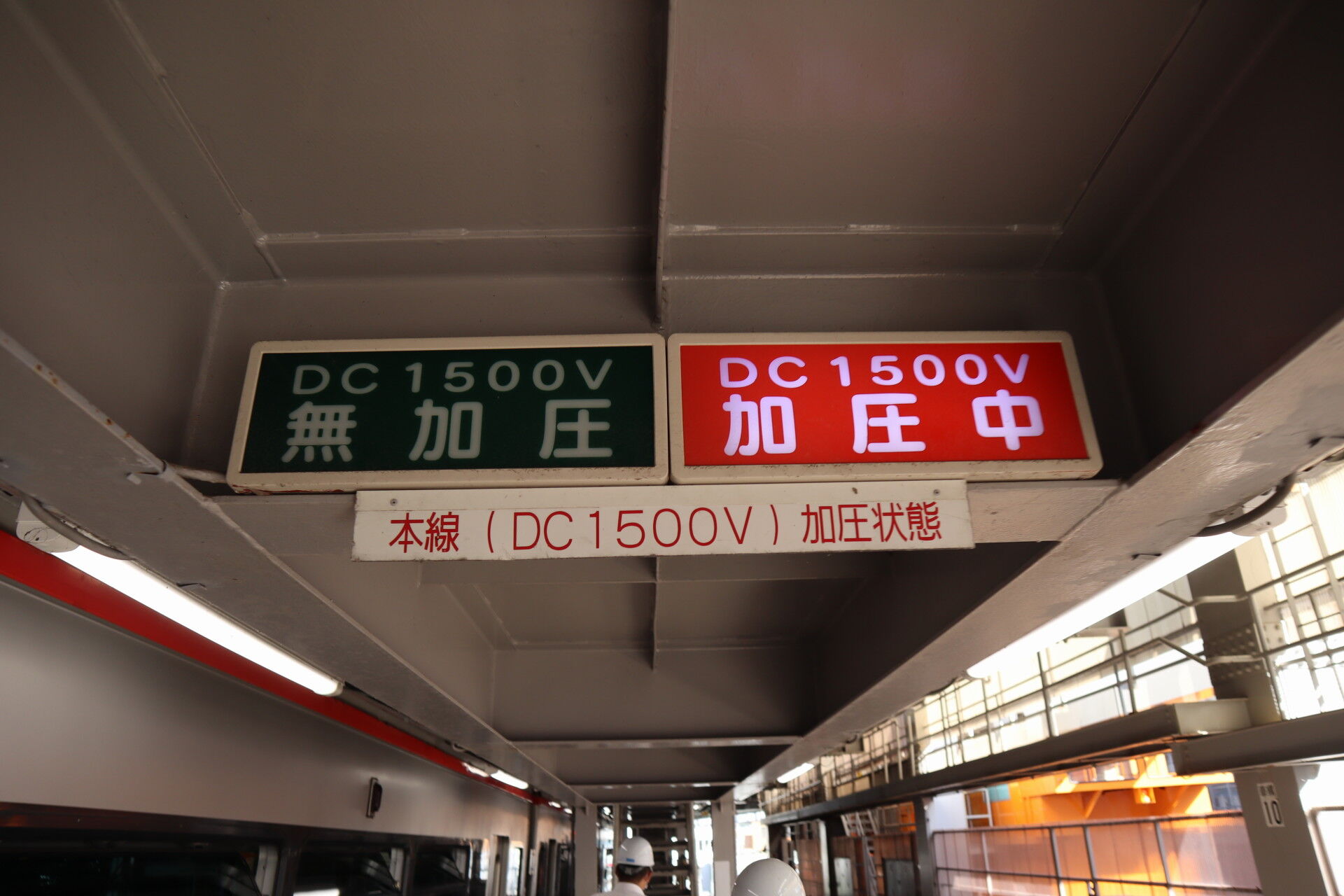 こちらが正電車線(プラスの架線)とパンタグラフです。