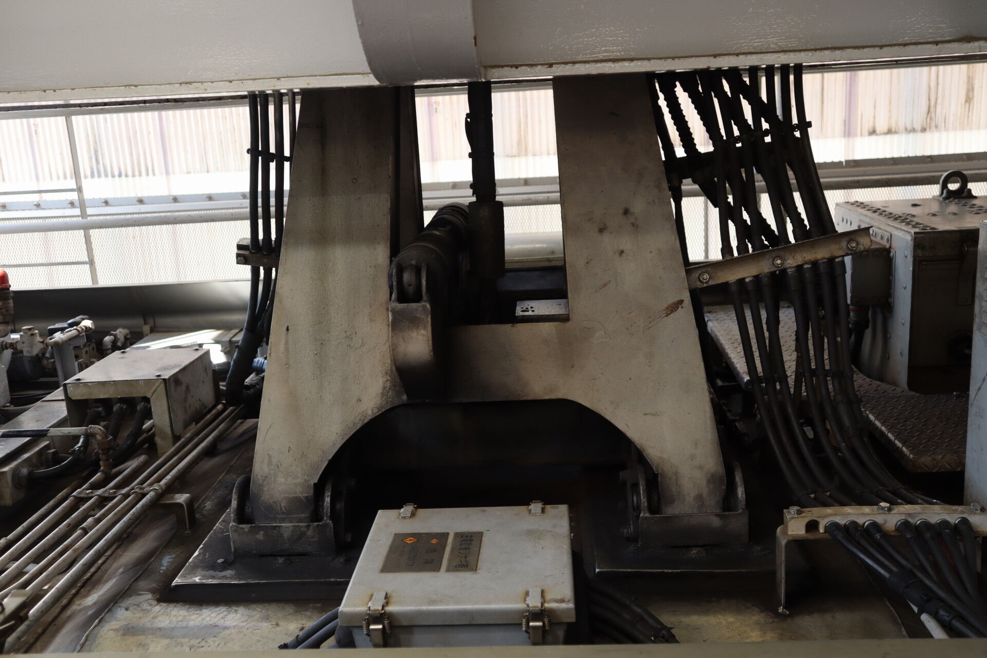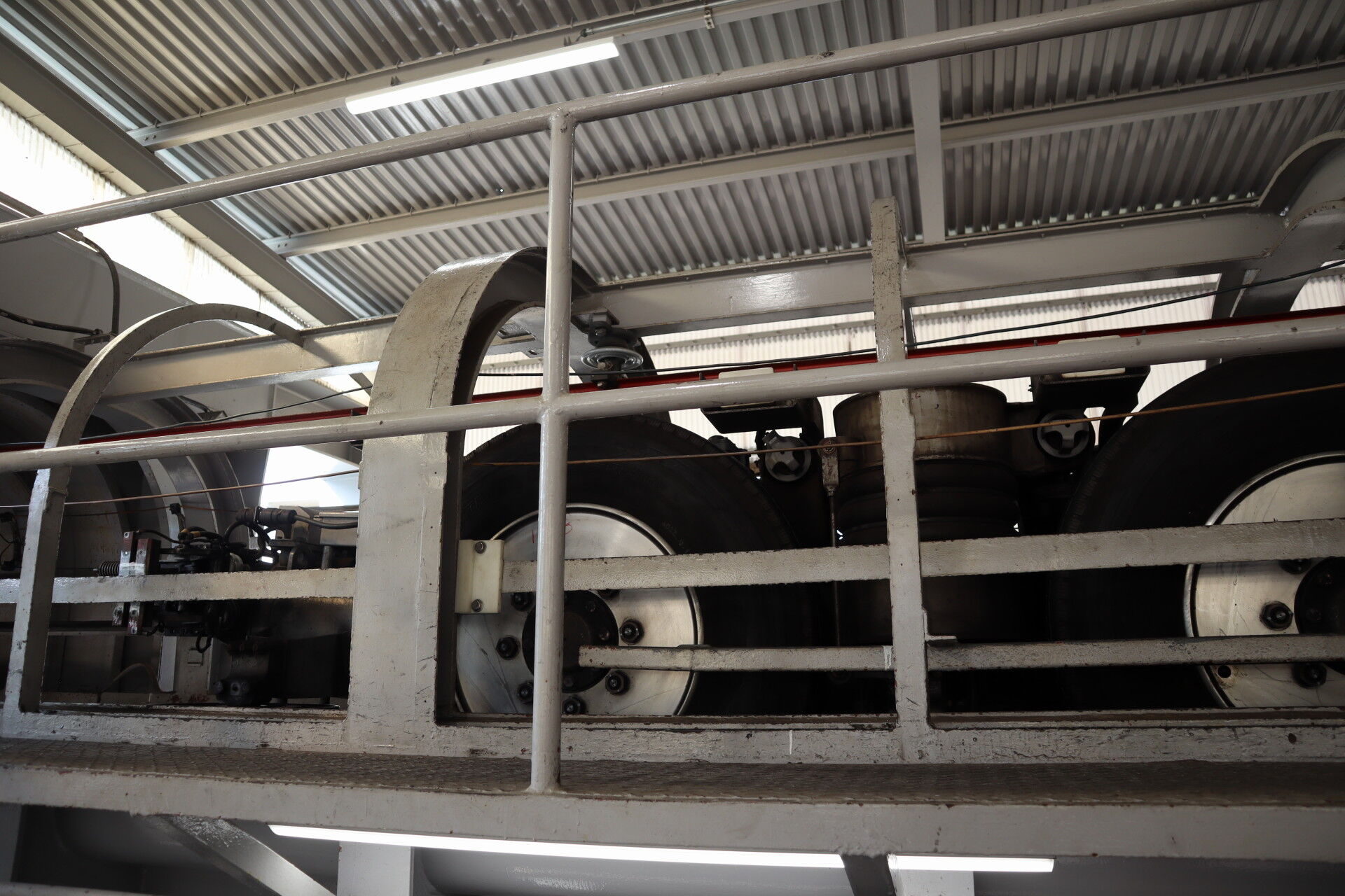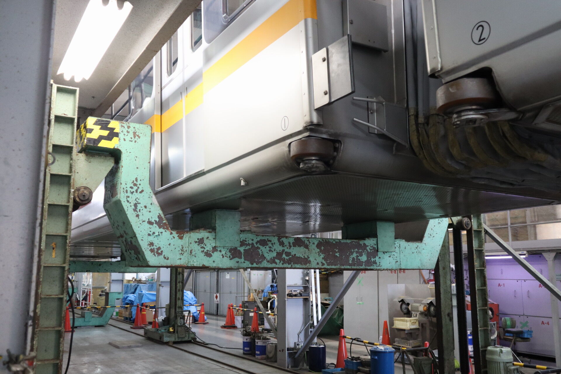 台車を切り離すときは、この台座の上に車体を置いて検査するとのこと。ジャッキアップ中の姿は極めて貴重とのことです。