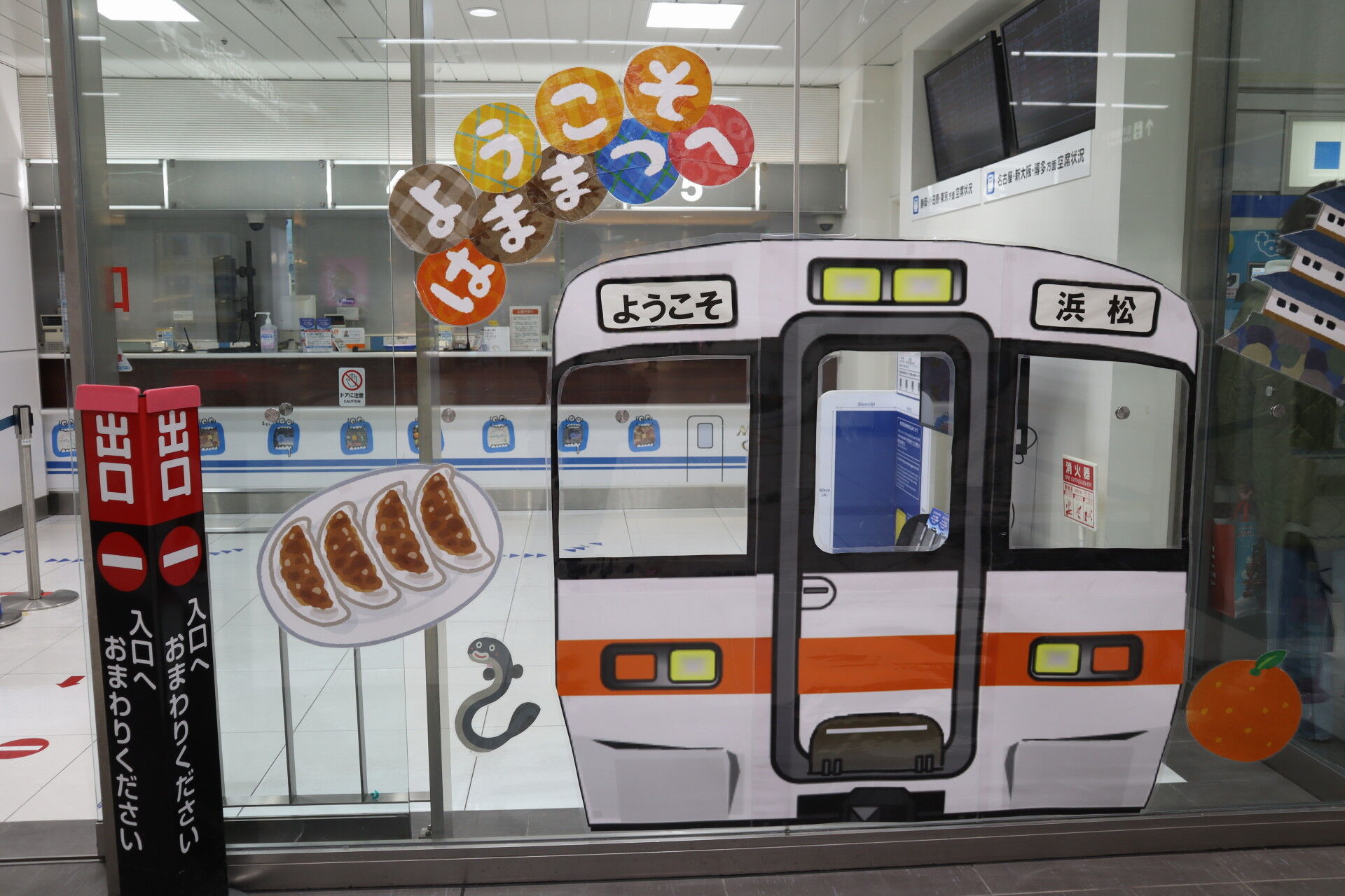 みどりの窓口には、ガラス壁を利用したフォトスポットがありました。顔出しパネルにできますね。