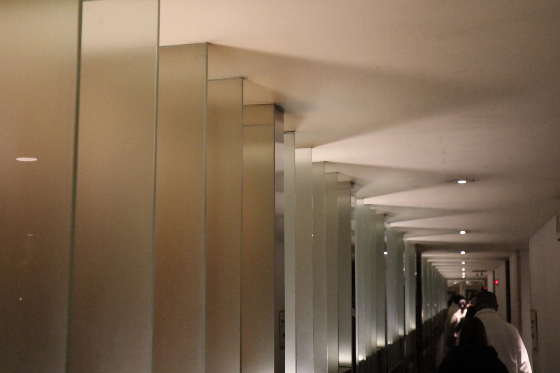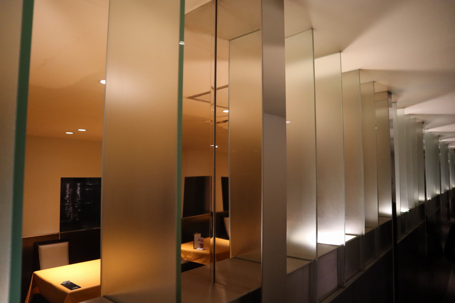 通路脇の客室ですが、すりガラスの壁がスリットのようになっています。