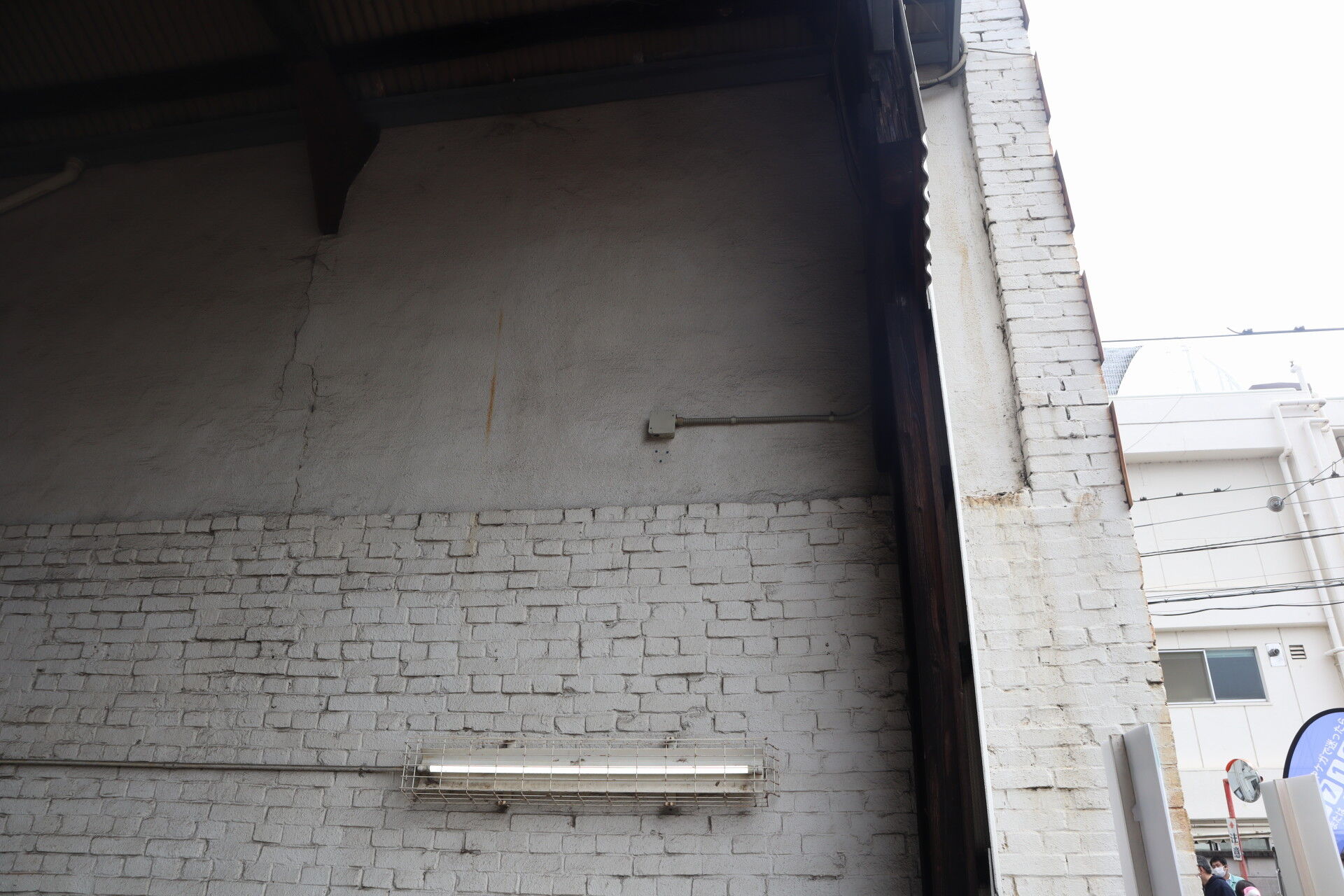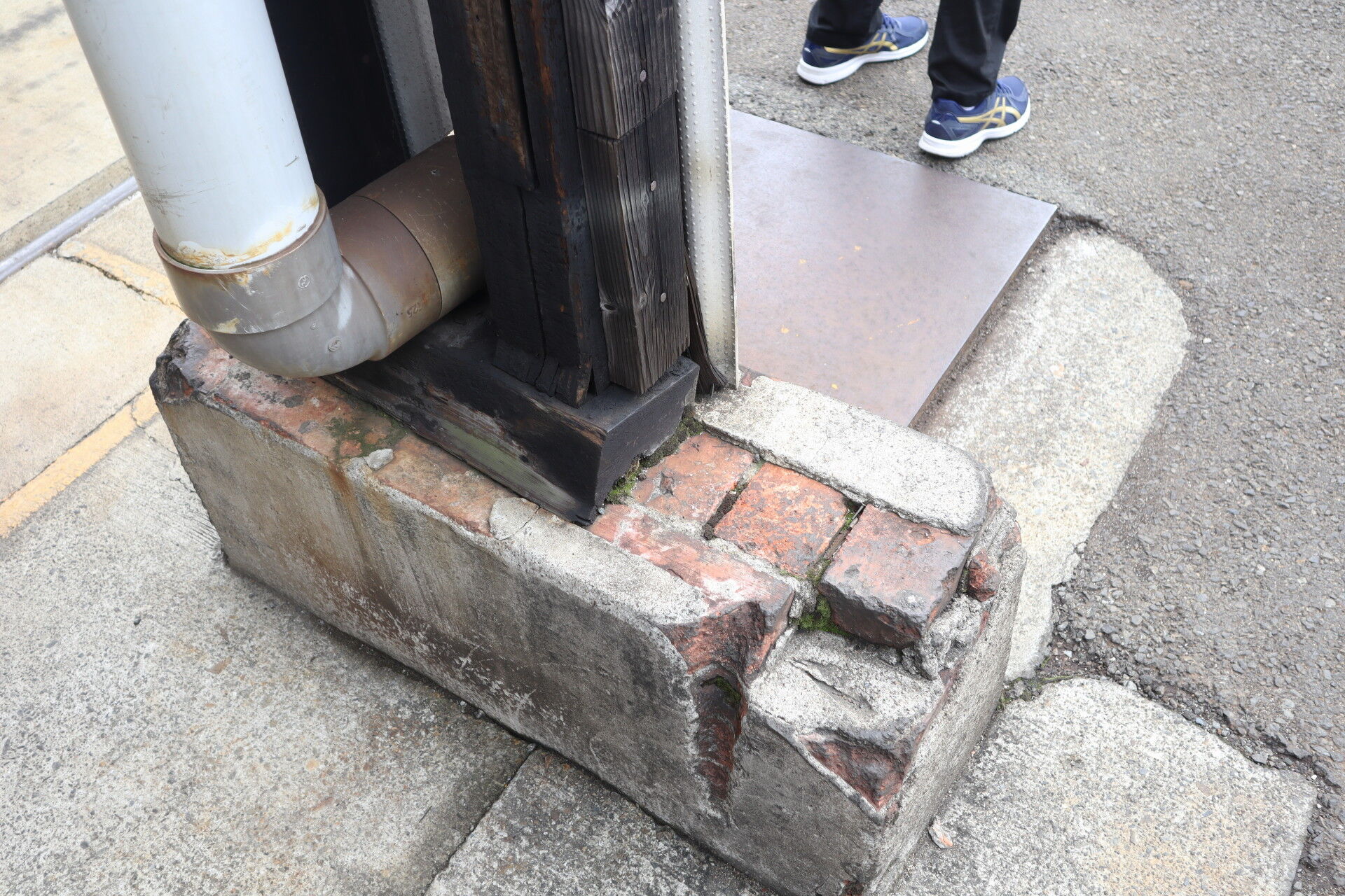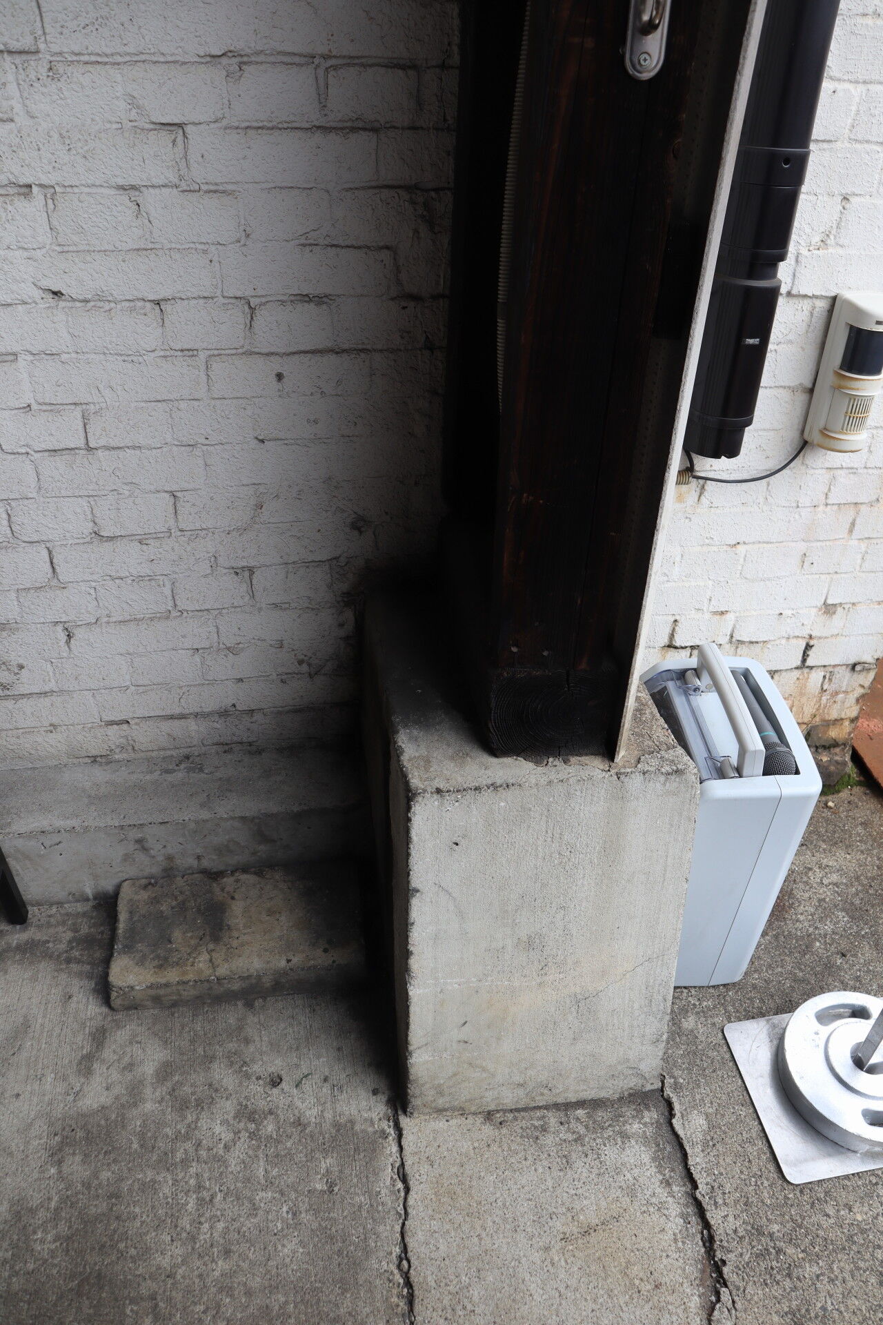 レンガ壁に接する木柱。