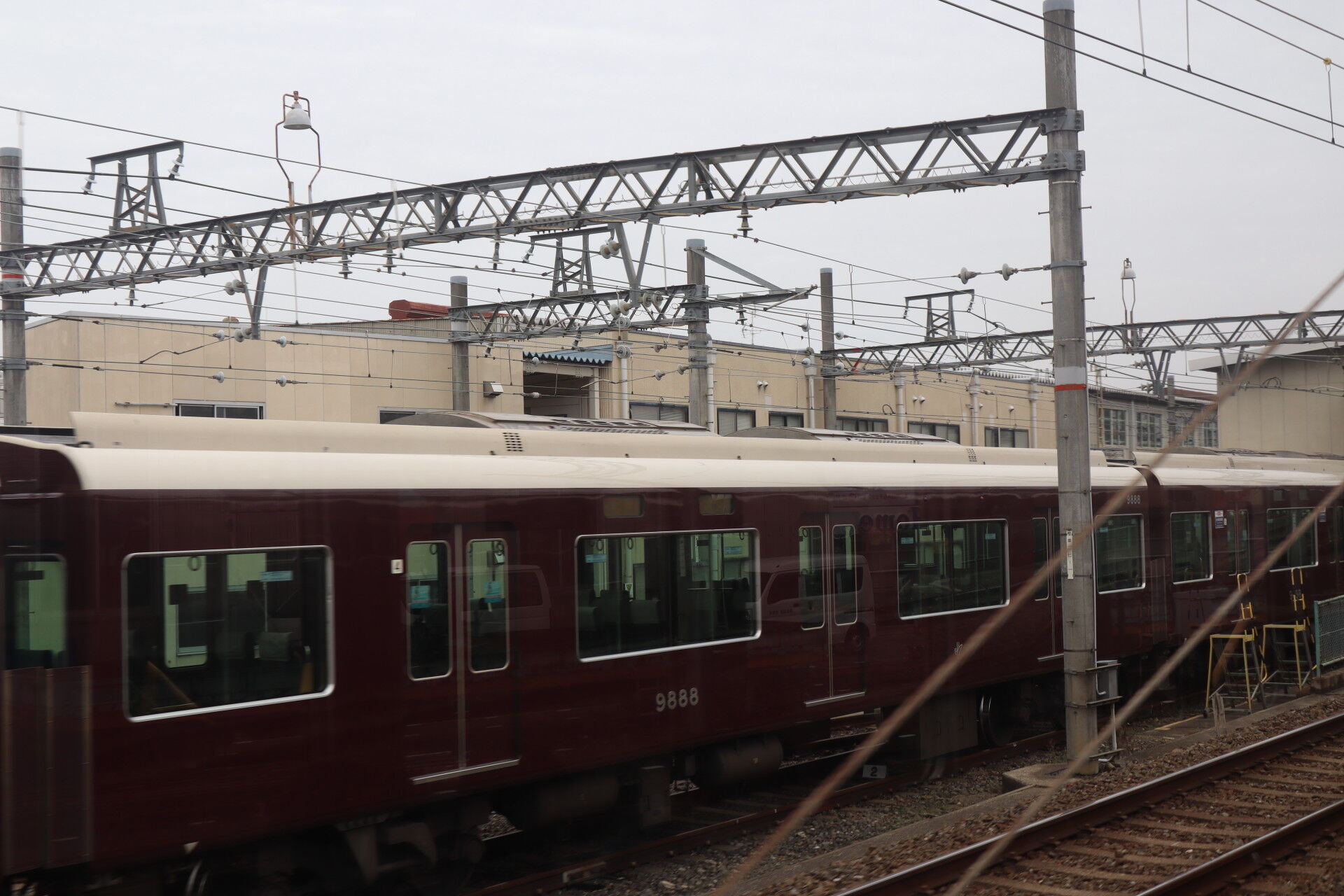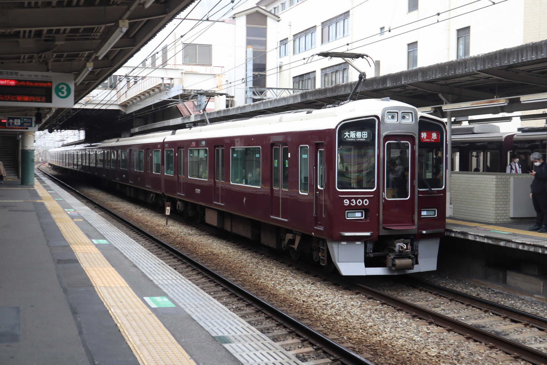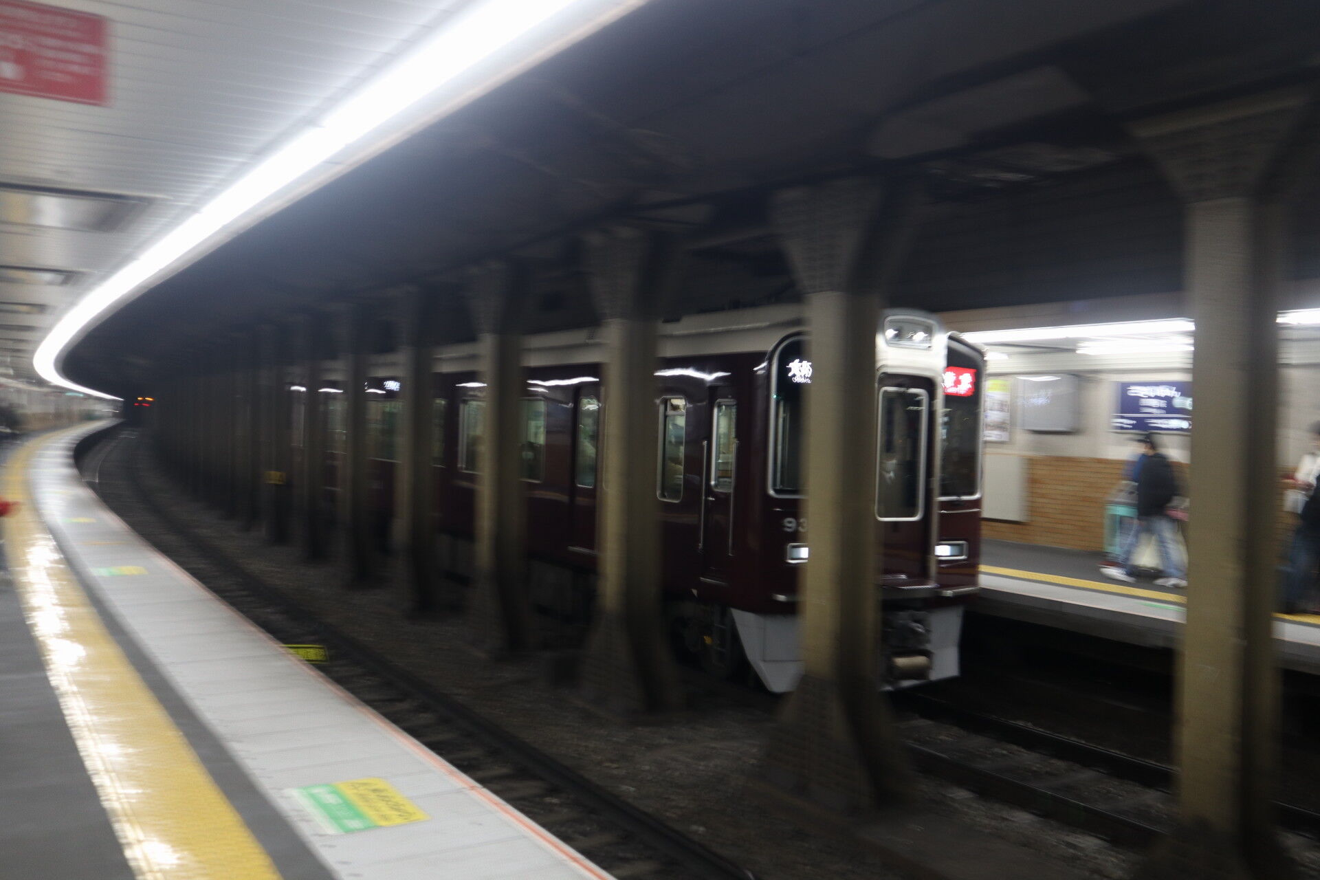 見送った特急が京都河原町から折り返してきた感じでしょうか。狭い柱の間を高速で通過していきます。
