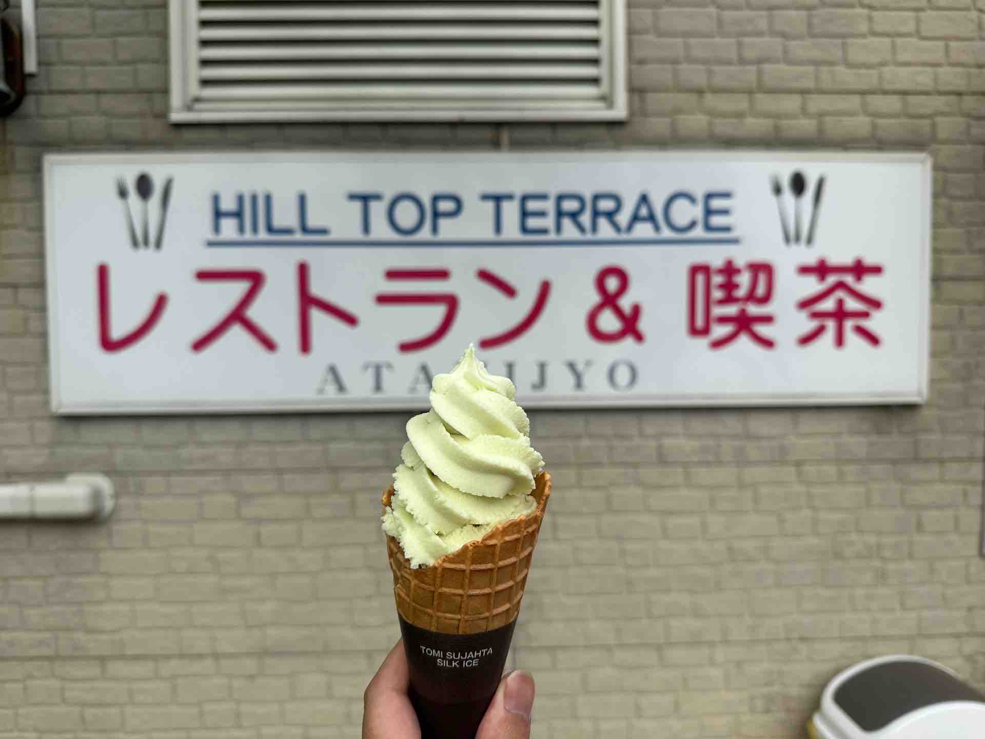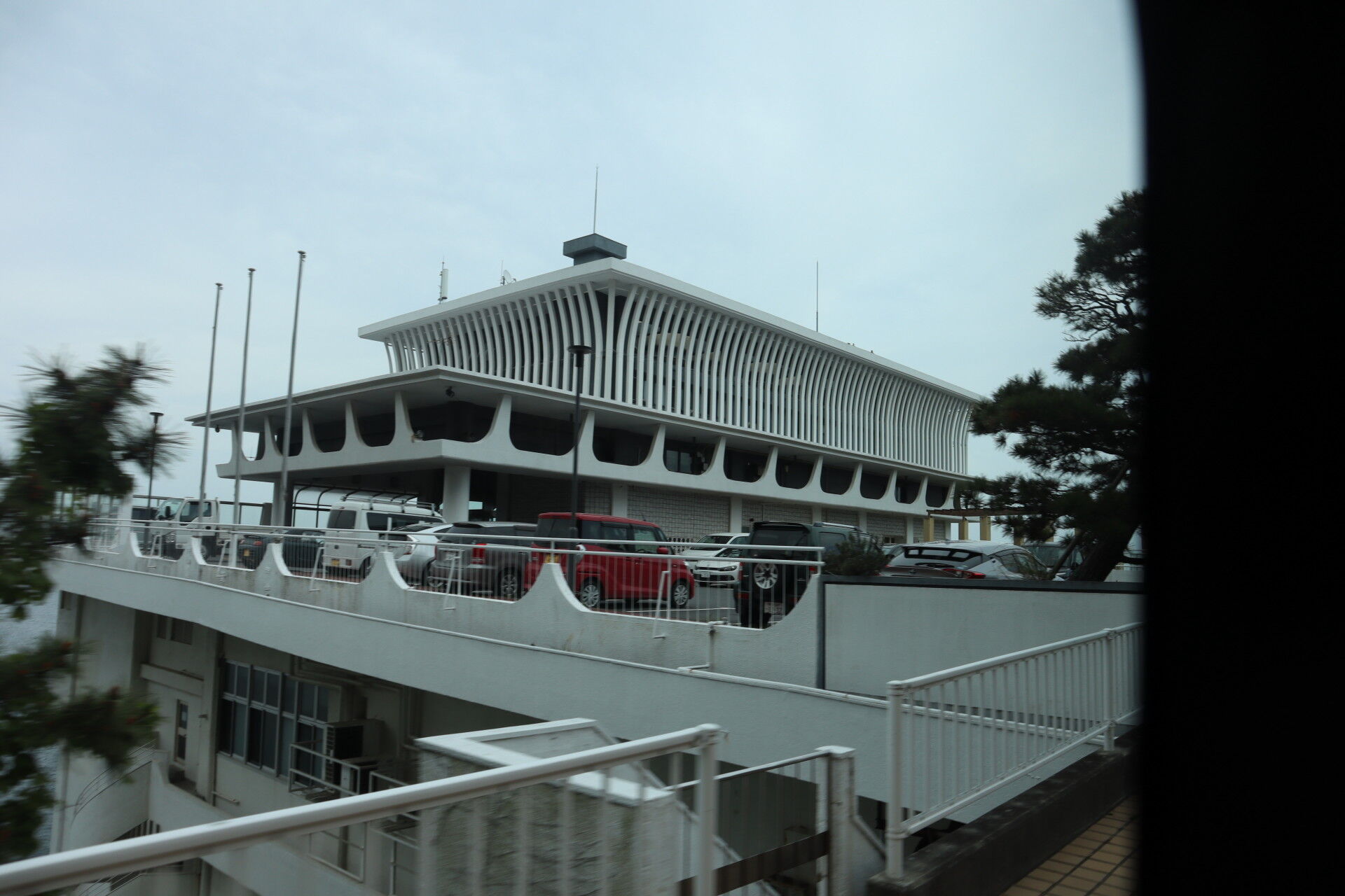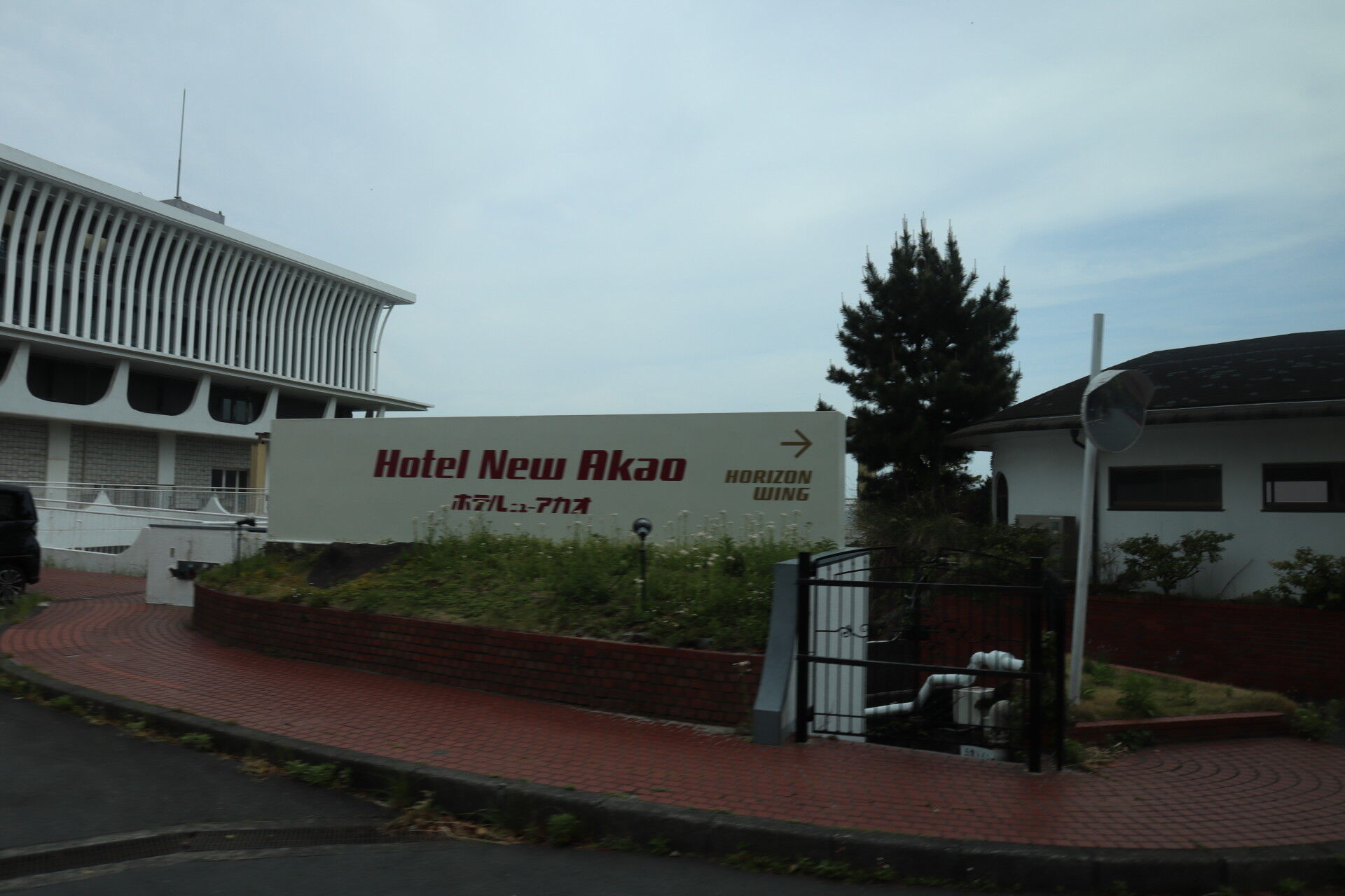 さっきソフトクリームを食べた喫茶店のテラスと、その下には崖にへばりついたニューアカオの建物があります。