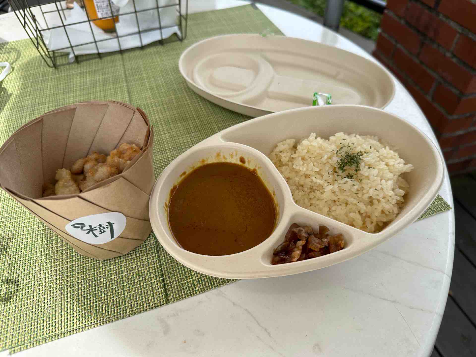 スパイスの香りがふぁーっと漂います。カレーは辛すぎず、唐揚げもぷりっと、全体的に優しい味付け。