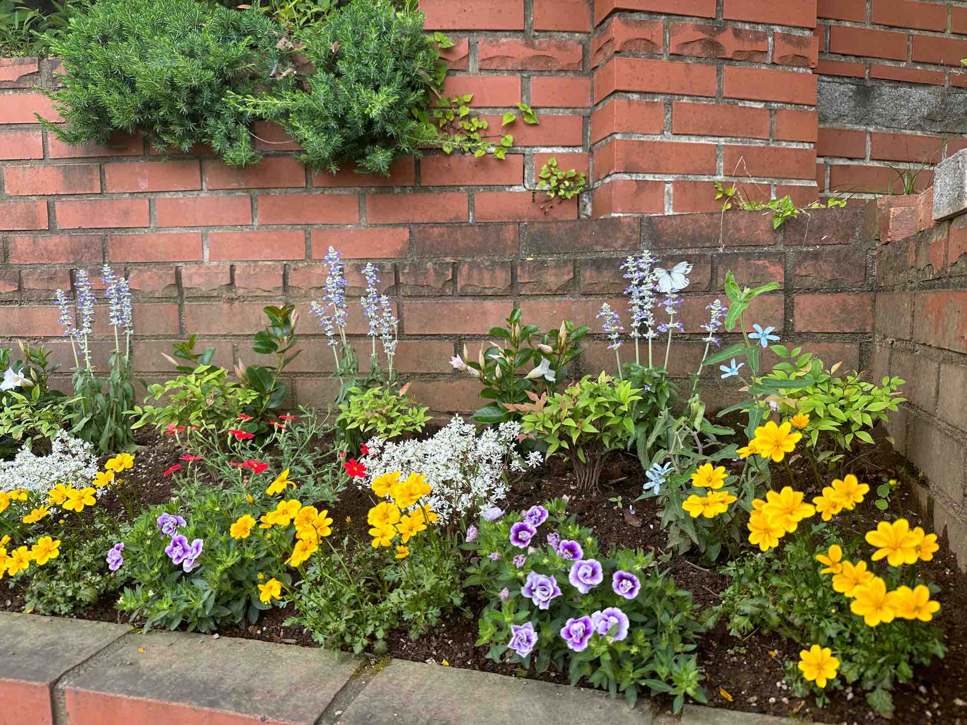 花壇にはモンシロチョウが飛んでいました。