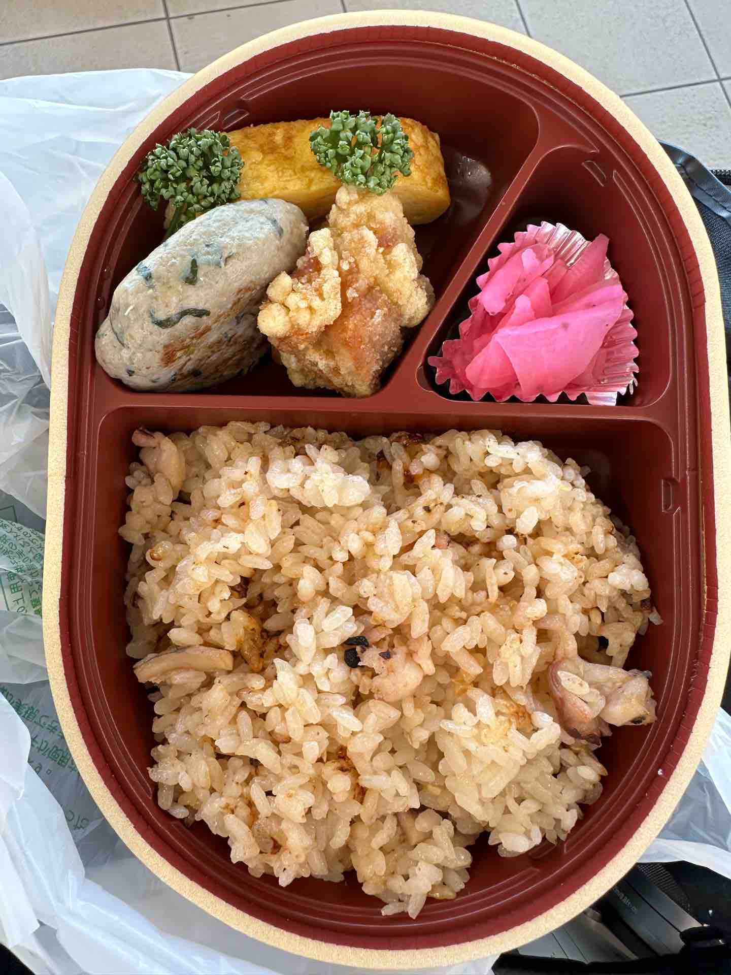 魚のバーグが入っていて、海の幸がふんだんに使われています。バランスの良いお弁当でした。