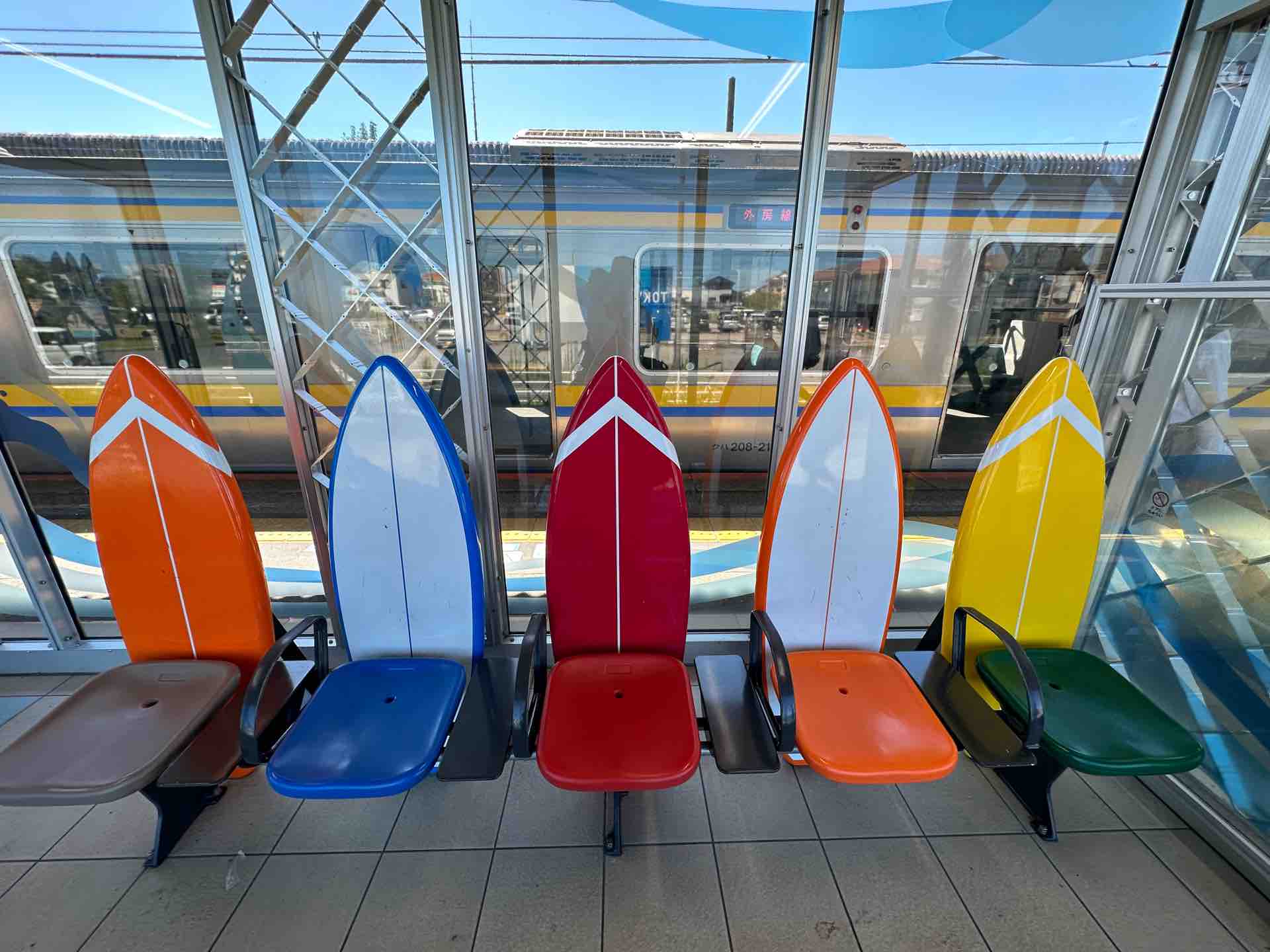 サーフボードをイメージした駅のベンチがありました。