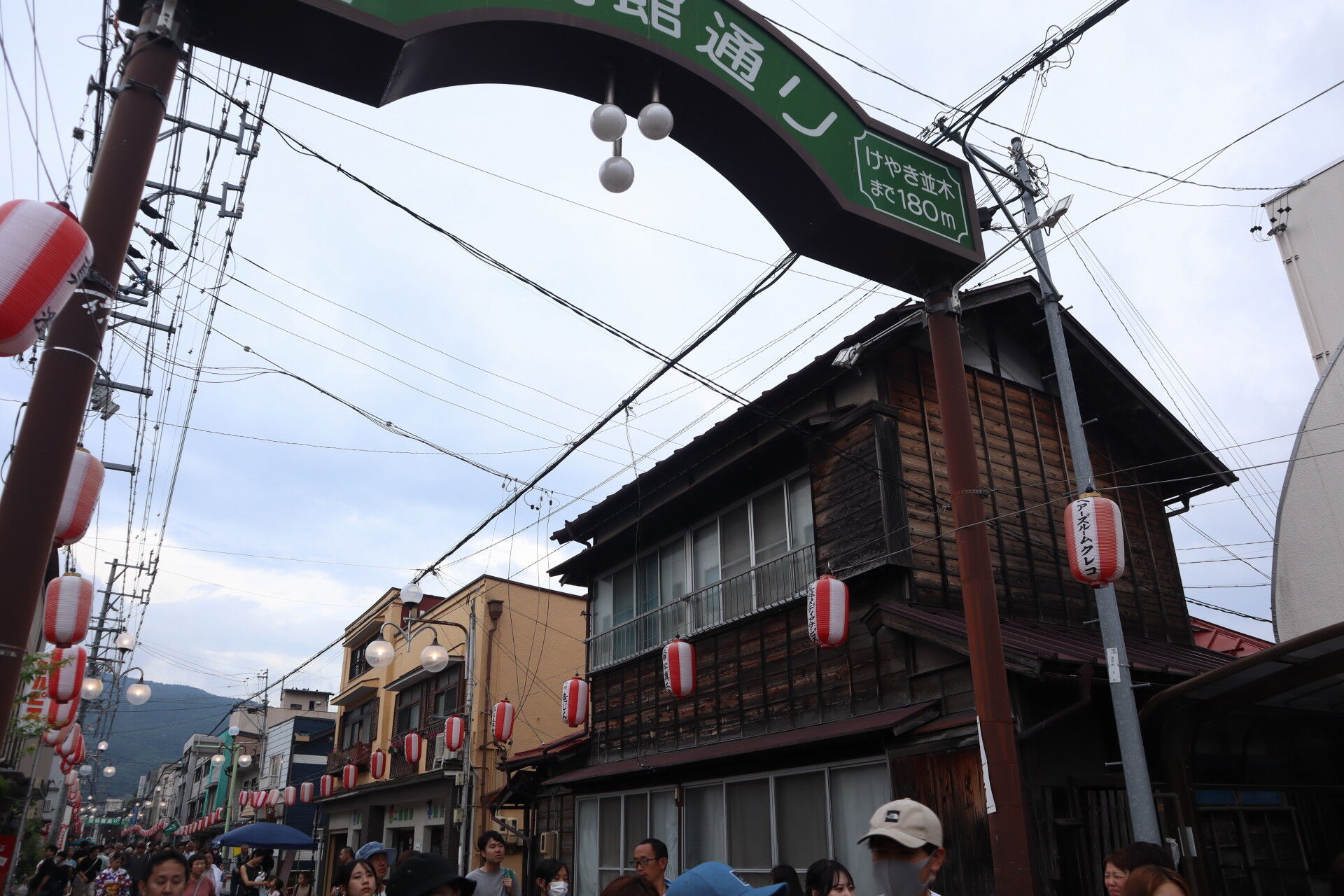 商店街が歩行者天国になっていて、街全体が花火一色、という感じです。